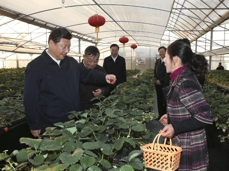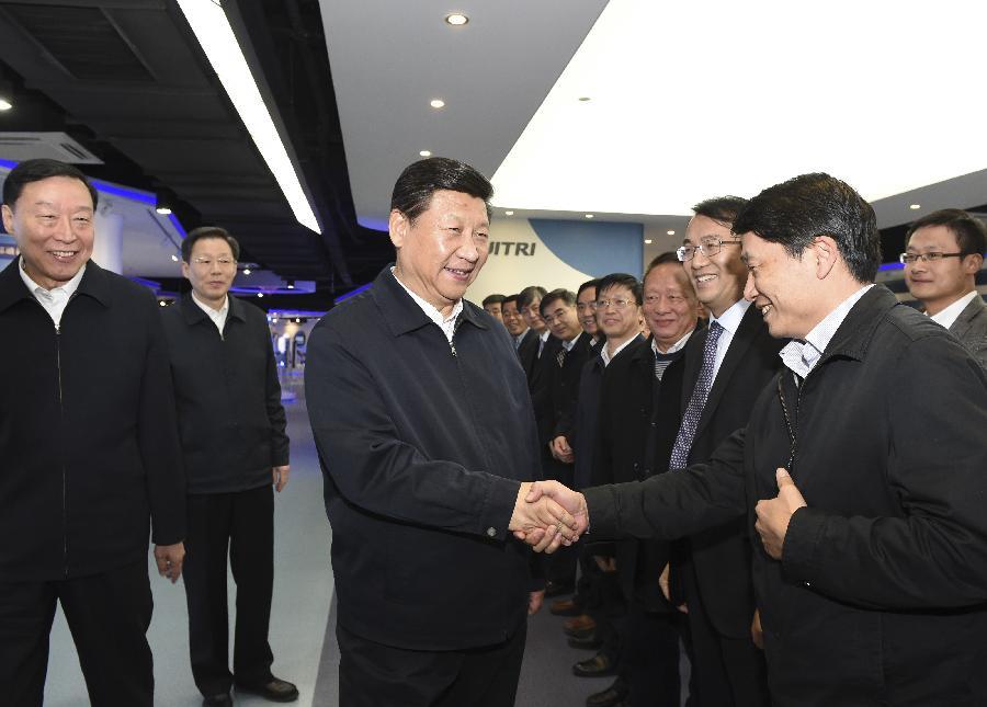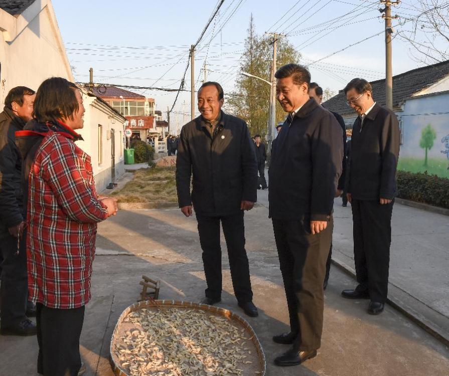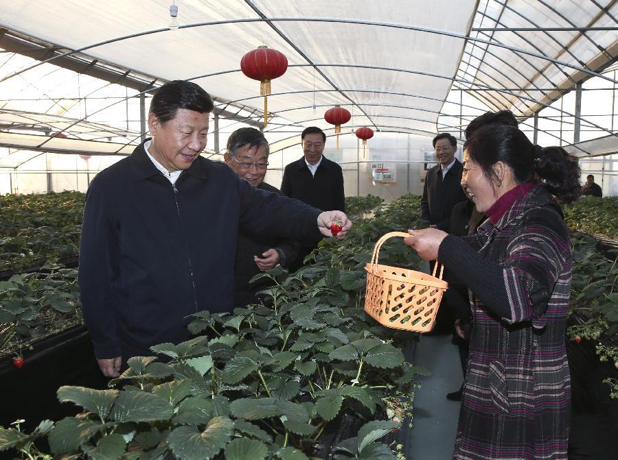 Chinese President Xi Jinping, also general secretary of the Communist Party of China (CPC) Central Committee and chairman of the Central Military Commission, shakes hands with local villagers as he visits the Yongmaoxu Village under Shiye Town in Dantu District of Zhenjiang City, east China's Jiangsu province, Dec 13, 2014. Xi made an inspection tour in Jiangsu Province from Dec 13 to 14, 2014. (Xinhua/Lan Hongguang)