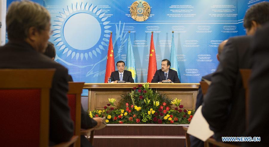 Chinese Premier Li Keqiang (L)and his Kazakh counterpart Karim Masimov attend the second regular meeting between the China-Kazakhstan heads of government in Astana, Kazakhstan, Dec 14, 2014. (Xinhua/Pang Xinglei)
