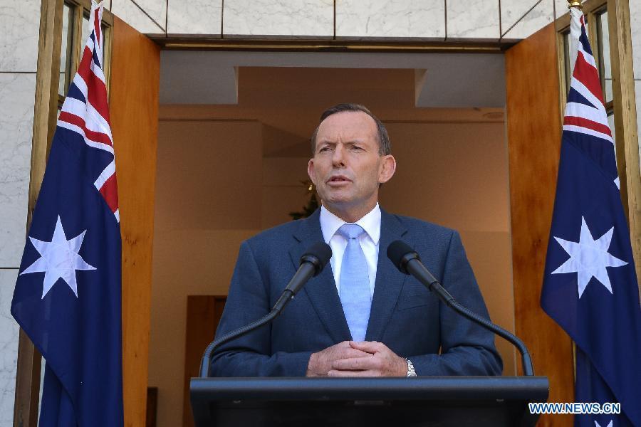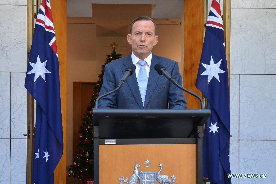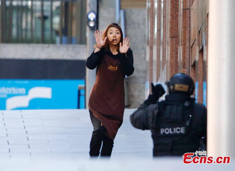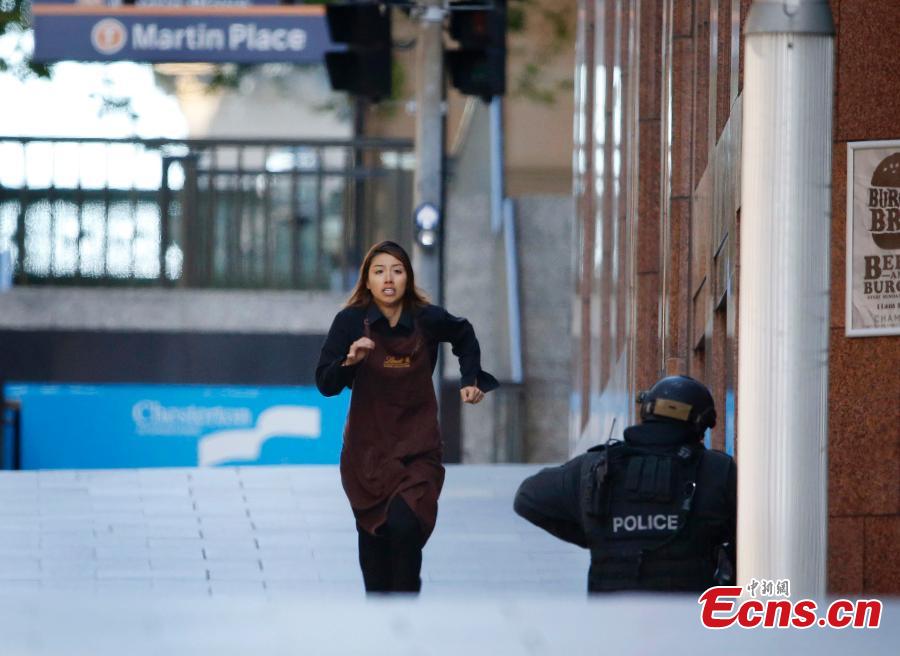 One female hostage runs to the police after being released from a Sydney cafe under siege on Dec 15, 2014. The cafe, located in the city center of the Sydney, has been held siege by an armed man showing Islamic flags at 9.30 am local time. Two female hostages wearing aprons were released and it is said that three people had fled before. [Photo/Agencies]