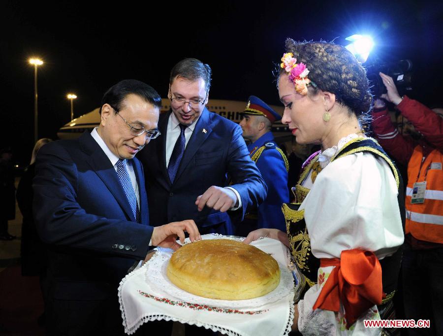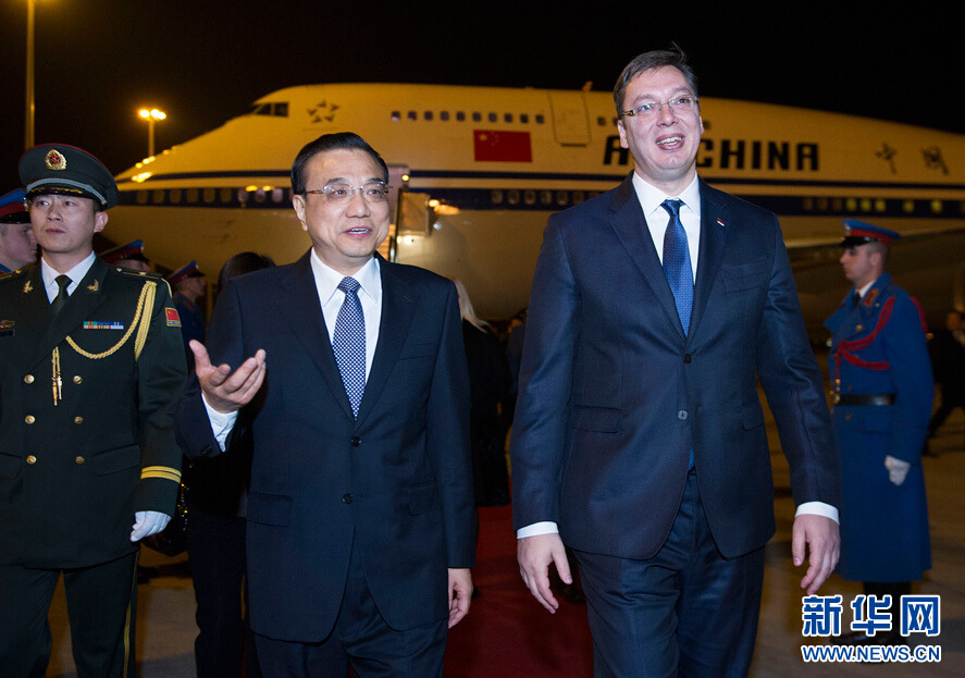 Chinese Premier Li Keqiang (L) is greeted by Serbian Prime Minister Aleksandar Vucic at the airport upon his arrival in Belgrade, Serbia, Dec 15, 2014. Chinese Premier Li arrived here for a leaders' meeting of China and Central and Eastern European (CEE) countries, and an official visit to Serbia. (Xinhua/Huang Jingwen)