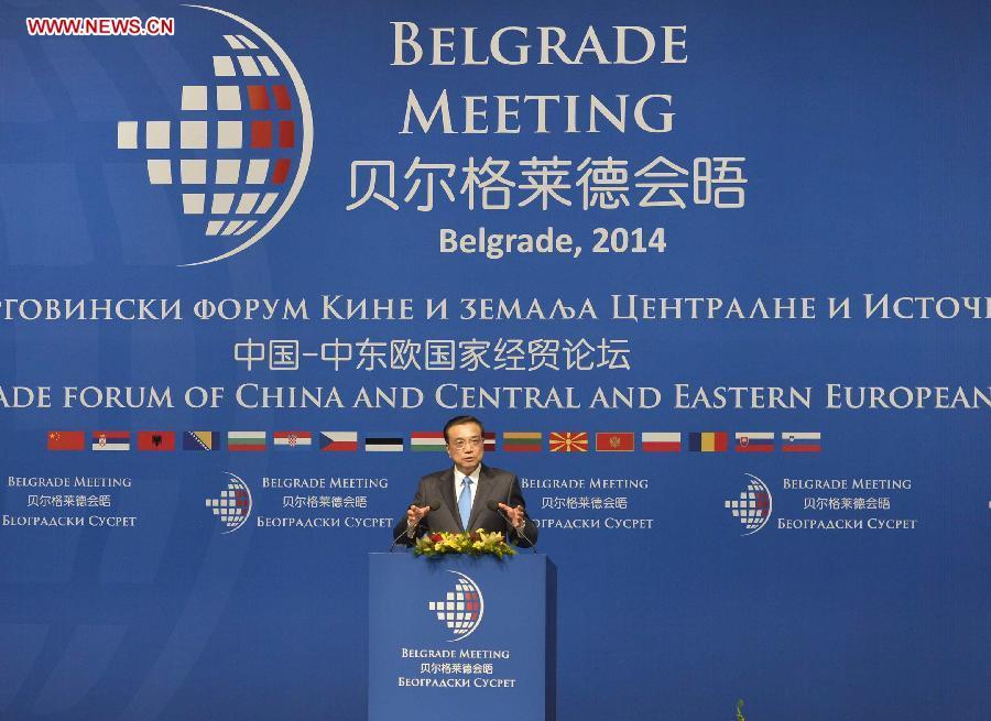 Chinese Premier Li Keqiang addresses the opening ceremony of the Economic and Trade Forum of China and Central and Eastern European Countries in Belgrade, Serbia, on Dec 16, 2014. (Xinhua/Liu Lihang)
