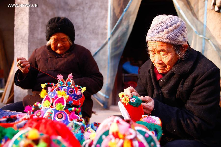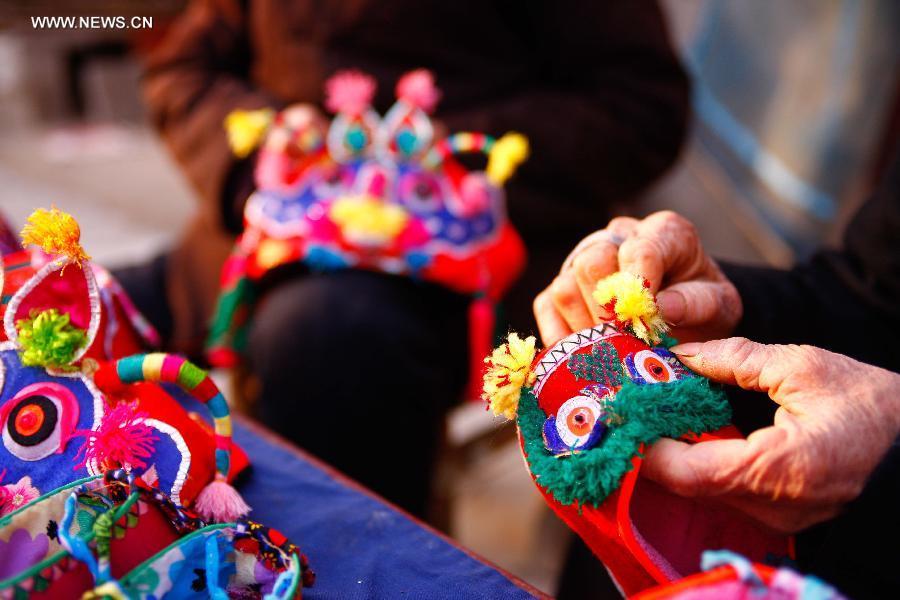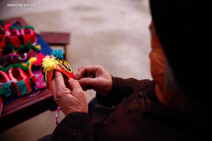 Photo taken on Dec 11, 2014 shows the tiger shoes made by Sun Jinglan and Li Xiuying in Sun Jinglan's home in Liwa Village, Duji District of Huaibei City, east China's Anhui province. Tiger shoes, a traditional wearing for children in China's countryside, symbolizes good wishes of people to bring good luck to their children. Sun Jinglan, 81-years-old, and Li Xiuying of the same age, have been making tiger shoes for years in Liwa Village. Many parents have bought their makings for their fine work, expecting them to be auspicious. The artwork has been listed as the intangible cultural heritage of Anhui province in 2014. (Xinhua/Zhu Weixi)