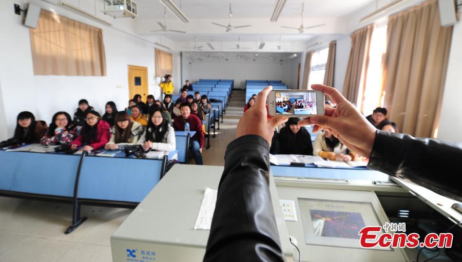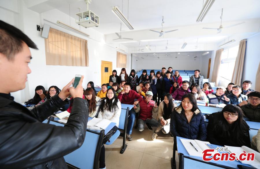Meng Xiangbin, a photojournalism teacher, takes a group photo of students before and after classes to keep track of attendance at Wuhan Media and Communications College, Huazhong Normal University, Wuhan city, Central China’s Hubei province, Dec 16, 2014. This new way of calling the roll not only intrigues students’ passion for photography but also reduces the frequency of them arriving late or leaving early, according to Meng. [Photo: China News Service/ Zhang Chang]