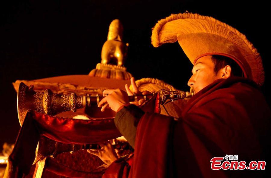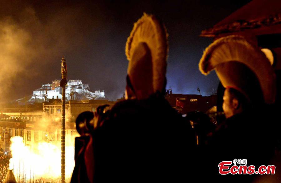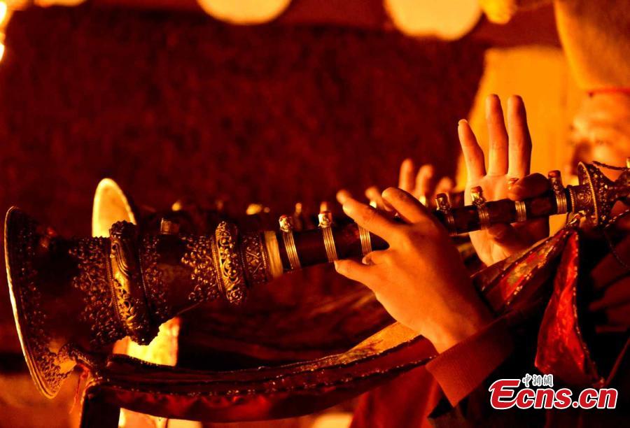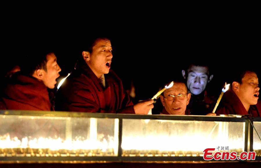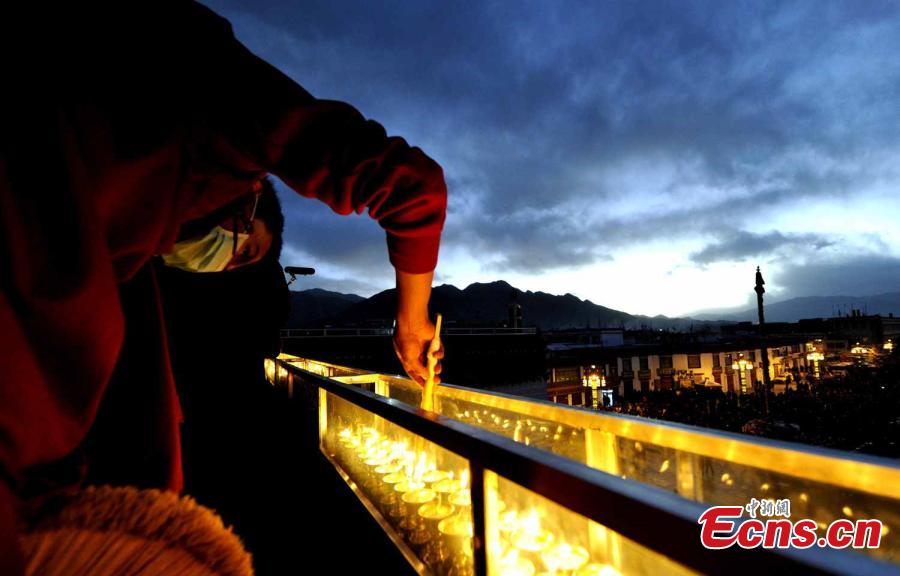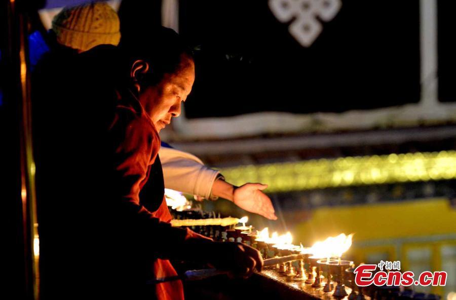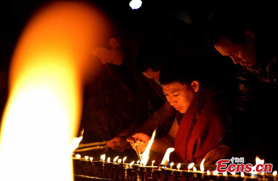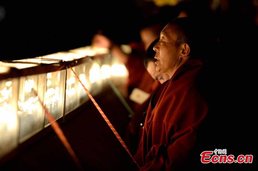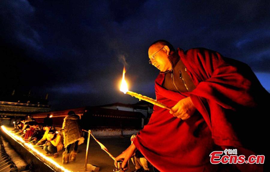 A monk lights butter lamps during the Butter Lamp Festival in the Jokhang Temple in Lhasa, Southwest China’s Tibet autonomous region, Dec 16, 2014. The festival, which falls on the 25th day of the 10th month of the Tibetan calendar every year, is in honor of nirvana or the enlightenment day of Je Tsongkhapa, the founder of the Gelukpa school of Tibetan Buddhism. [Photo: China News Service/Li Lin]