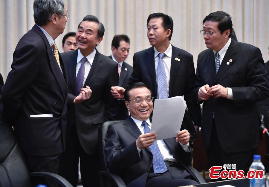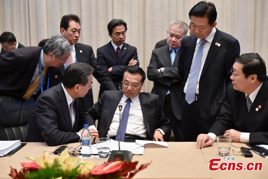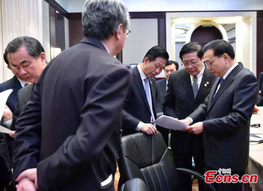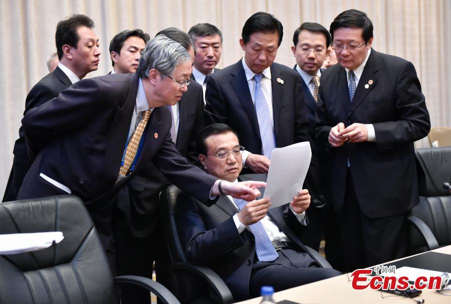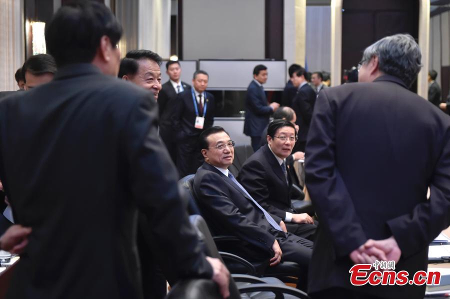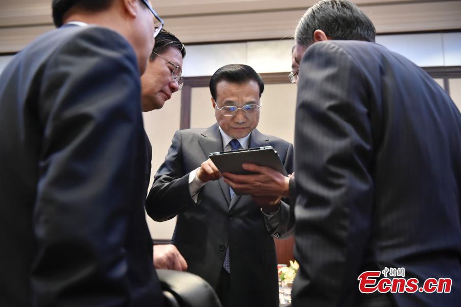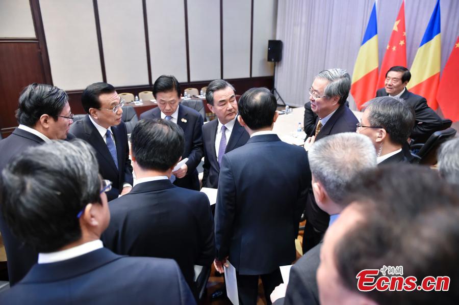 When attending the third China-Central and Eastern European (CEE) Leaders' Meetings in Serbia, Dec 16, Premier Li Keqiang grasps moments to talk with the Chinese ministers in between his highly intense meetings with leaders from the 16 CEE countries. [Photo: China News Service/Liu Zhen]