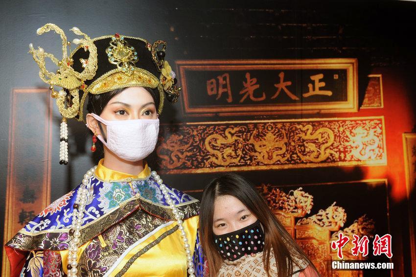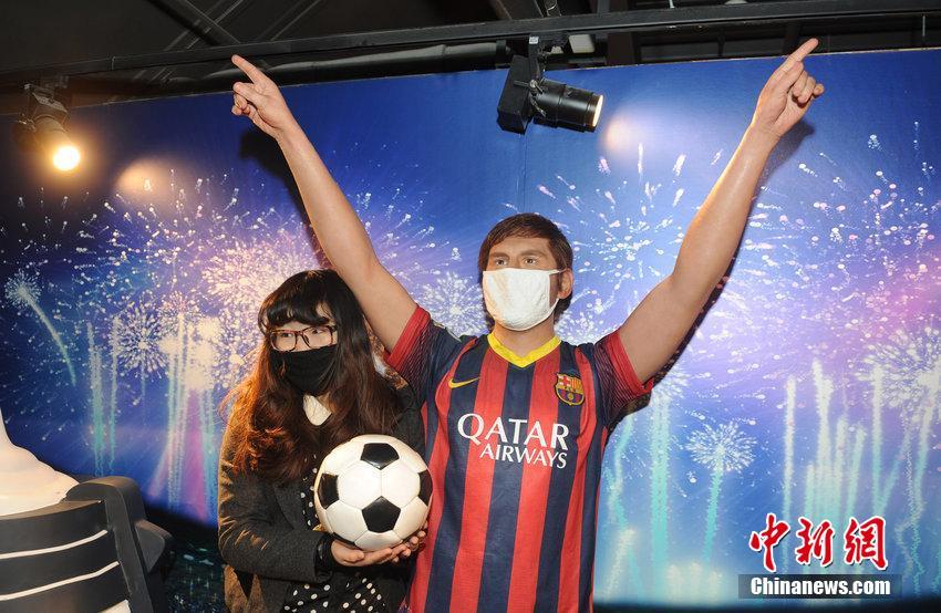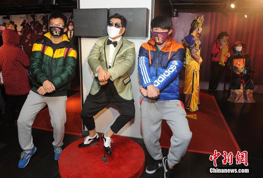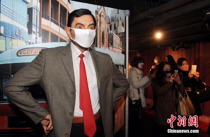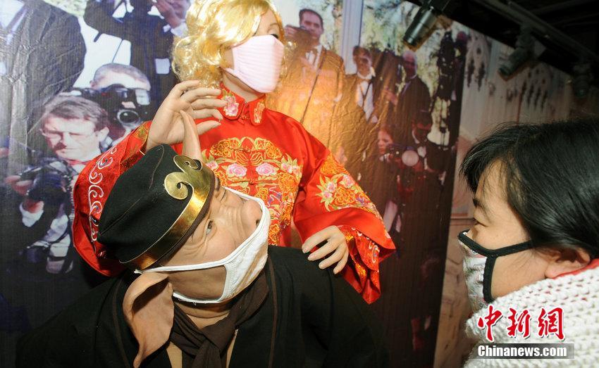 A visitor looks at wax sculptures wearing masks during an event in Taiyuan, North China’s Shanxi province, Dec 18, 2014. Organizers put masks on wax sculptures of celebrities and characters from TV series and movies. The event, which required visitors to wear masks too, aimed to enhance the public awareness of environmental protection and low-carbon lifestyle. [Photo: China News Service/Bai Qingxia]