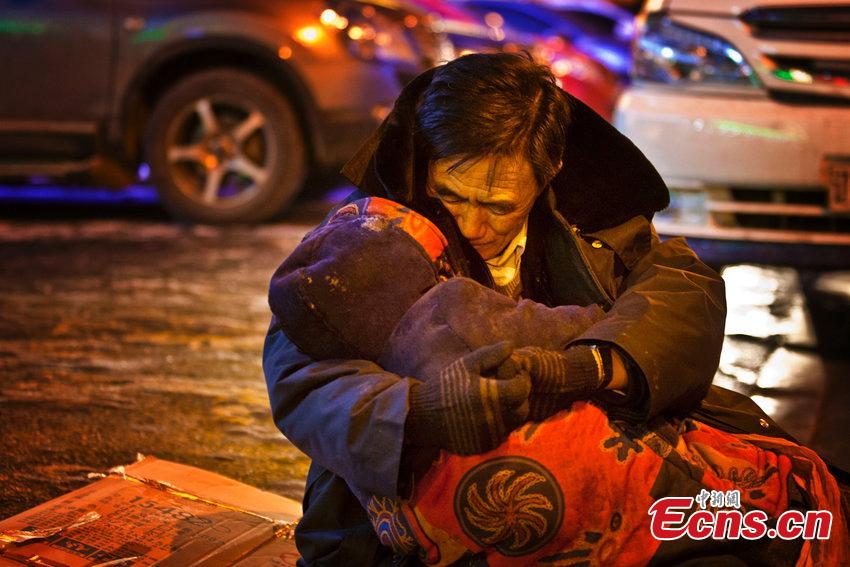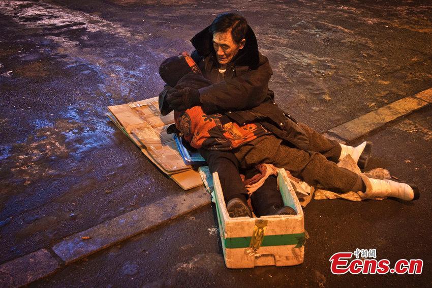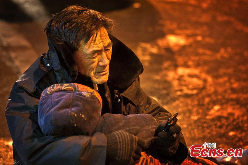 An old man holds his wife, who died of heart attack, on a street in Shenyang, Northeast China’s Liaoning province, Dec 17, 2014. The woman was found dead on her way to buy medicine at around 6 pm as the city’s temperature dropped to minus 24 degrees Celsius. The man surnamed He kept holding his wife for two hours without moving in bitter cold after he arrived at around 7 pm. The old couple, both 63, was waiting for their son to take them back to their hometown in Fushun, Liaoning province. The photos have touched millions of people on the Internet just one month ahead of the Spring Festival, China’s Lunar New Year and the most important traditional holiday. [Photo: CFP]