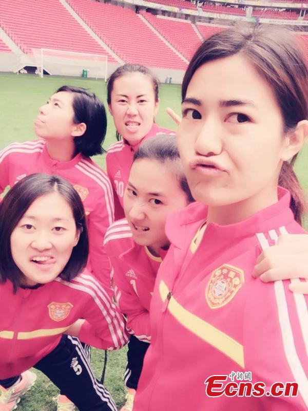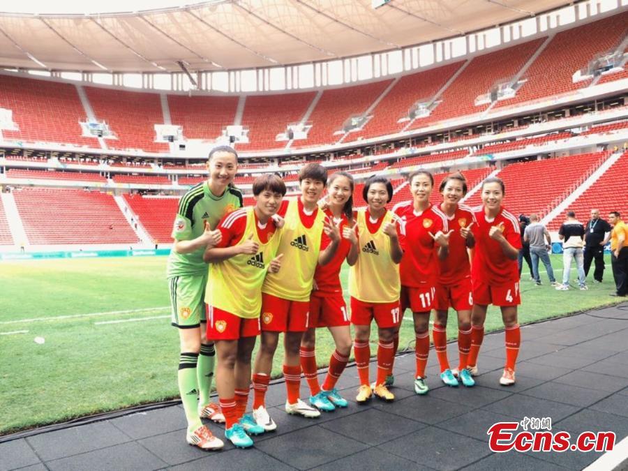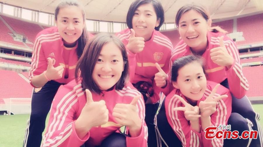 Members of China’s women’s soccer team pose for a photo after training in Brasilia, Brazil, Dec 19, 2014. The team was crushed 1:4 by Brazil in the International Tournament of Brasilia, a four-team warm-up competition to prepare for next year’s World Cup in Canada. [Photo/Osports]