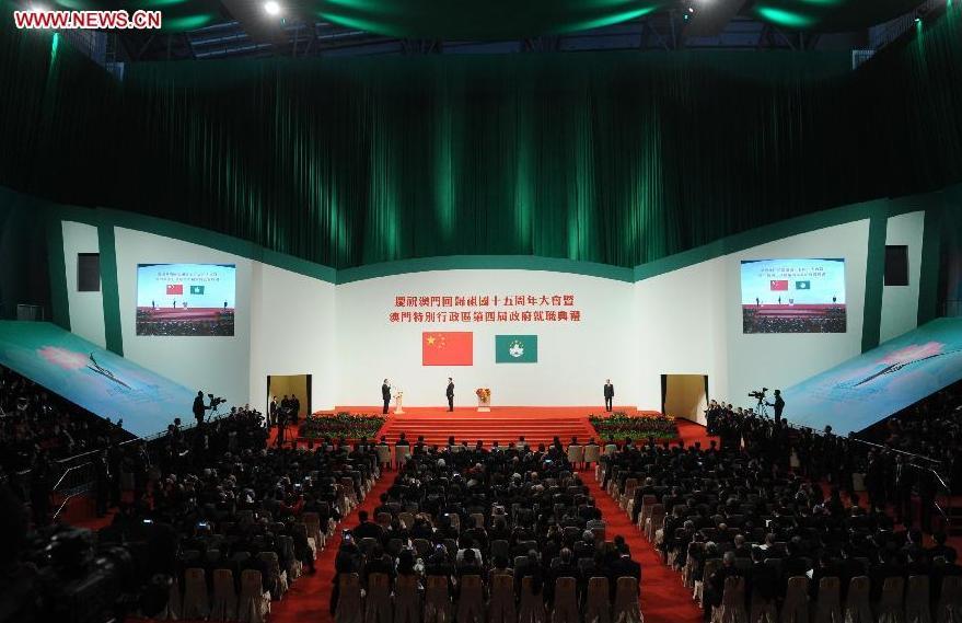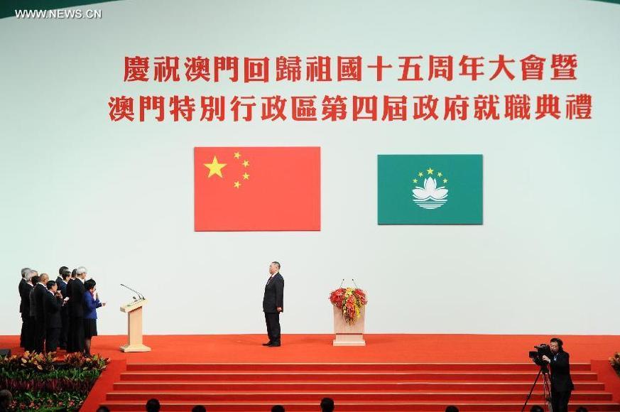 Administered by Chinese President Xi Jinping, Chui Sai On is sworn in as the fourth-term chief executive of the Macao Special Administrative Region (SAR) at a celebration gathering marking the 15th anniversary of Macao's return to the motherland in Macao, south China, Dec. 20, 2014. Chinese President Xi Jinping attended the celebration gathering and the inauguration of the fourth-term chief executive and government of the Macao SAR on Saturday morning. (Xinhua/Zhang Duo)