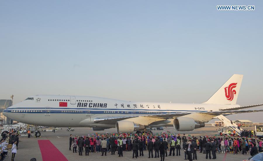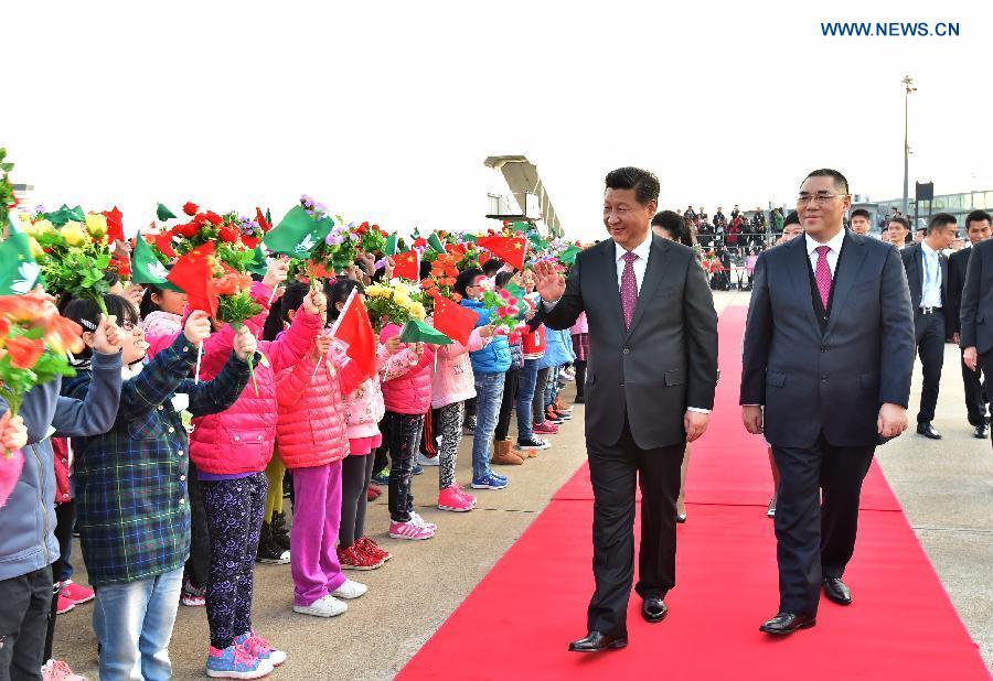 Chinese President Xi Jinping waves to people at the airport in Macao, south China, on Dec. 20, 2014. Xi ended his two-day visit to Macao on Saturday after attending celebrations marking the 15th anniversary of Macao's return to China and the inauguration of the fourth-term government of the Macao Special Administrative Region. (Xinhua/Li Tao)