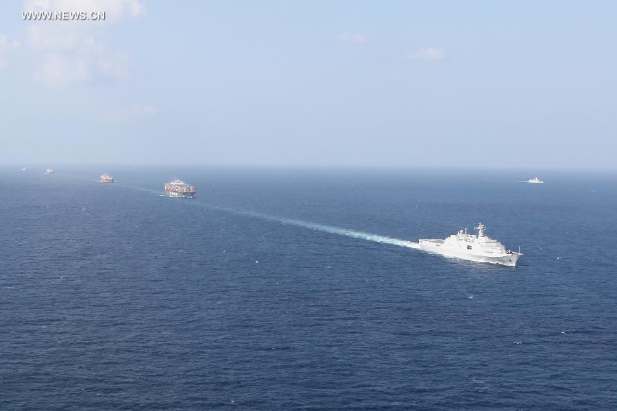 Changbaishan Warship (R) is seen during a convoy mission executed by five warships from the 18th and 19th batches of convoy fleets sent by the Chinese People's Liberation Army Navy in the Gulf of Aden, on Dec 20, 2014. (Xinhua/Zhang Yuelin)