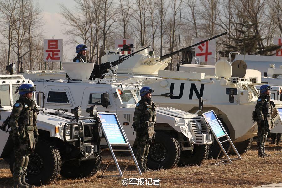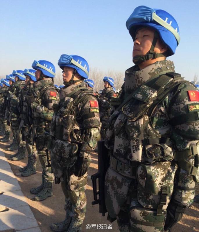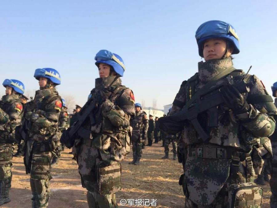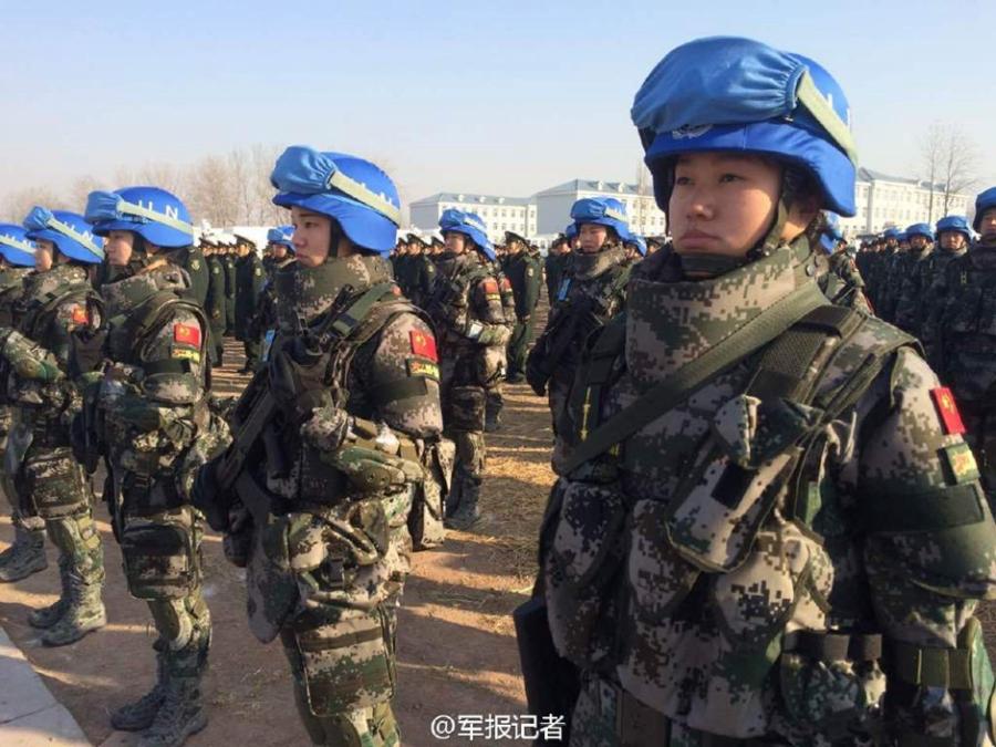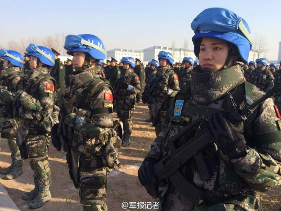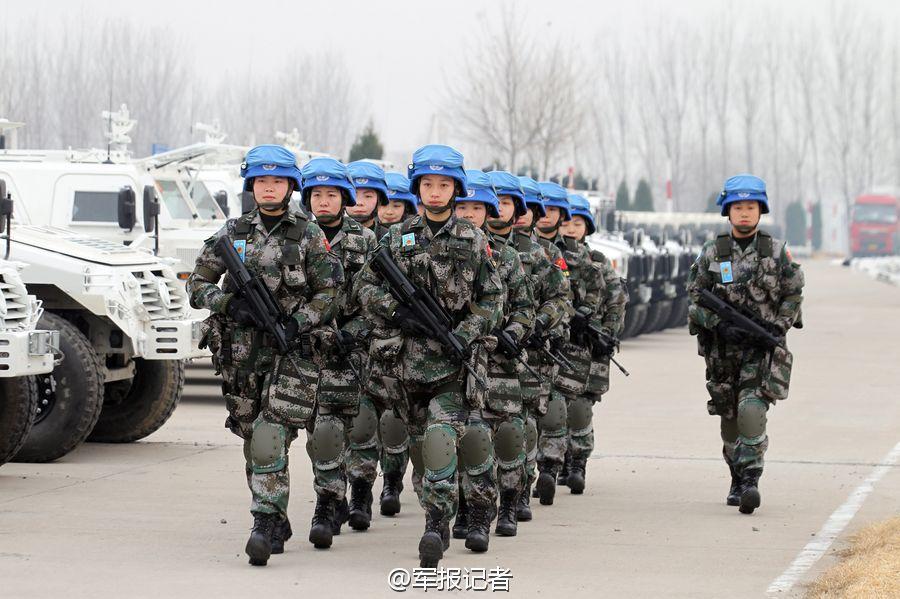 Female soldiers attend a ceremony marking the departure of a contingent of Chinese peacekeepers to South Sudan at a military base in Jinan, East China’s Shandong province, Dec 22, 2014. China has sent its first infantry battalion, including 13 female soldiers, to participate in a peacekeeping mission in Juba, South Sudan’s capital. [Photo/ Weibo account of PLA Daily]