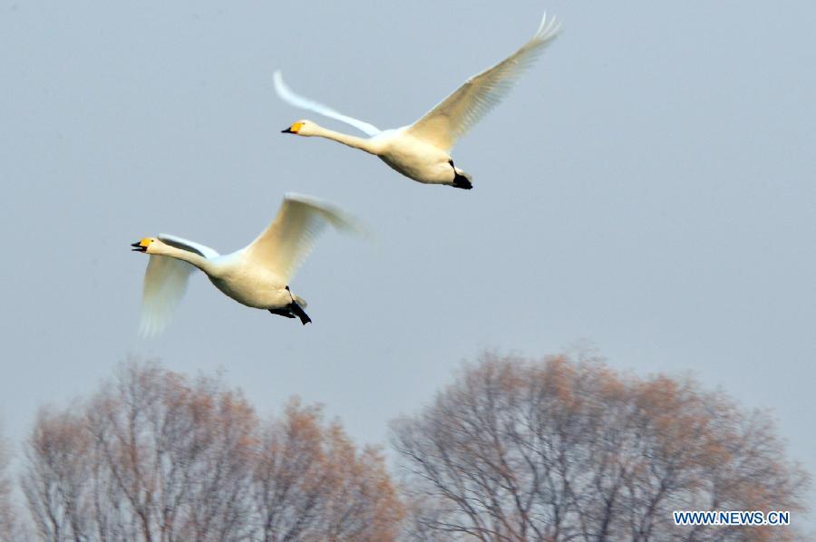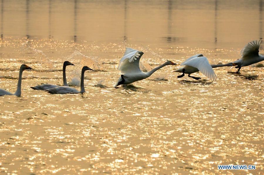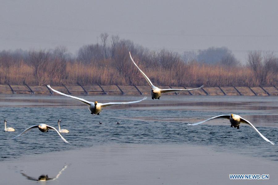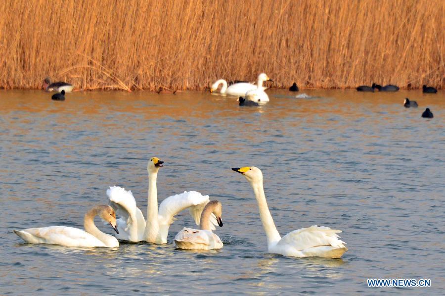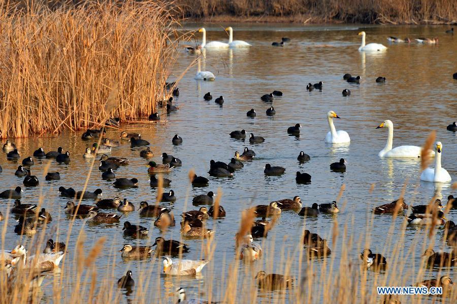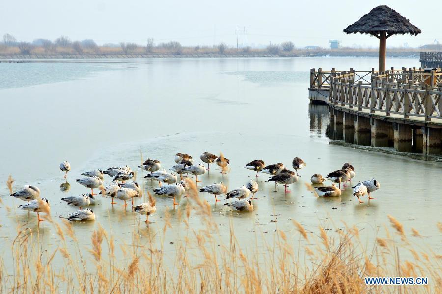 Migratory birds are seen at the Yellow River Delta Nature Reserve in east China's Shandong province, Dec 21, 2014. (Xinhua/Guo Xulei)