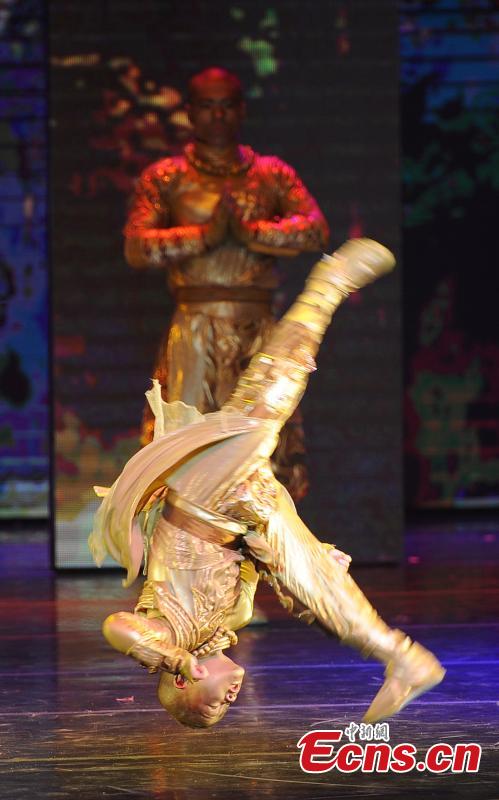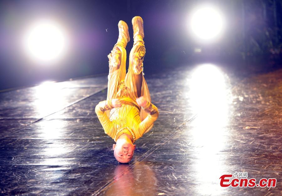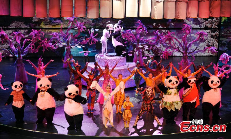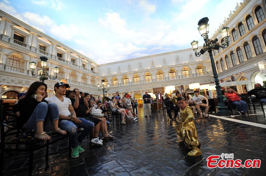 Zhao Zhenghui, 9, performs during a promotion event for PANDA! in front of a hotel in Las Vegas, US. The Chinese-produced stage show has been performed there since Jan 11, 2014 and has combined high-flying acrobatics, thrilling martial arts and Chinese music and dance. Zhao from Zhengzhou, Central China’s Henan province is a performer in the show. [Photo: China News Service/Mao Jianjun]