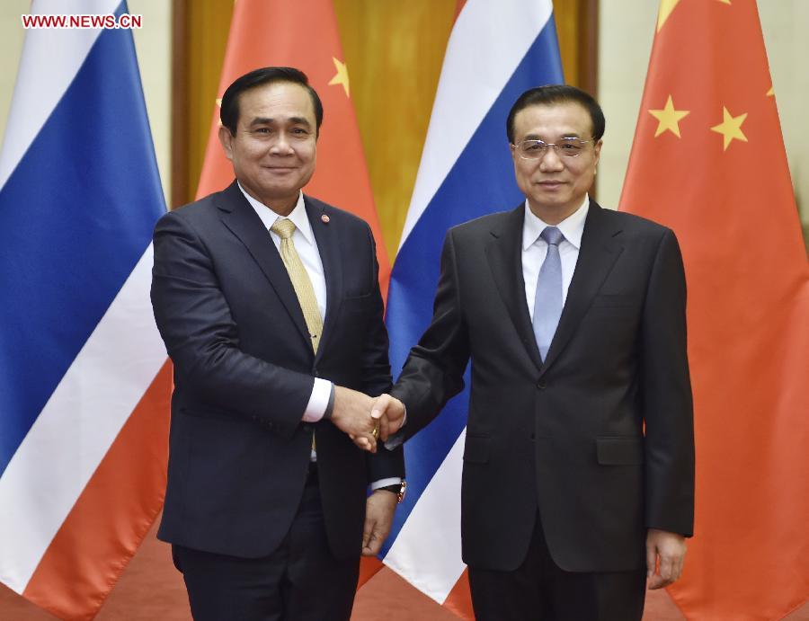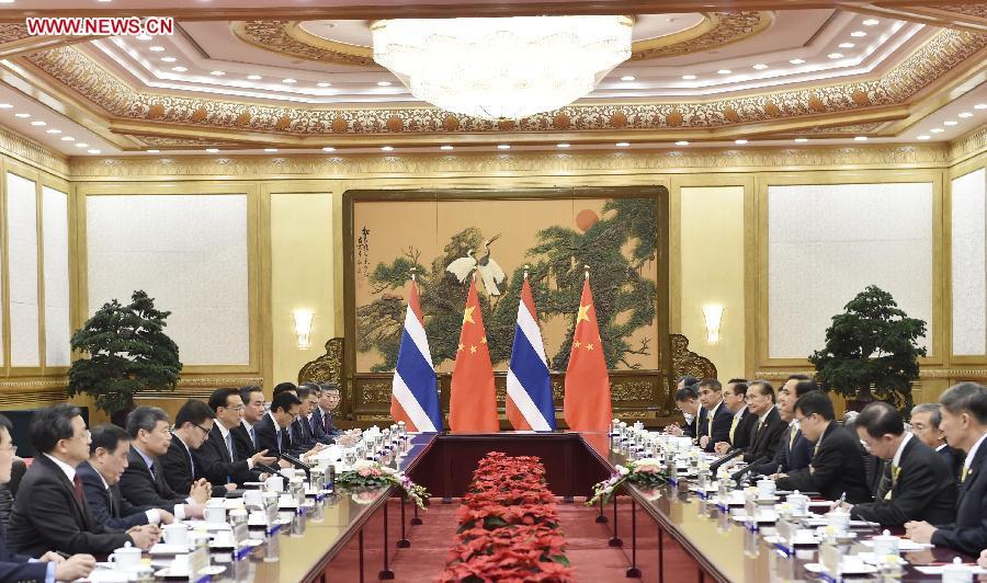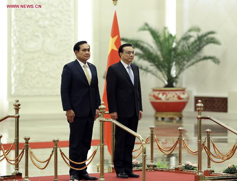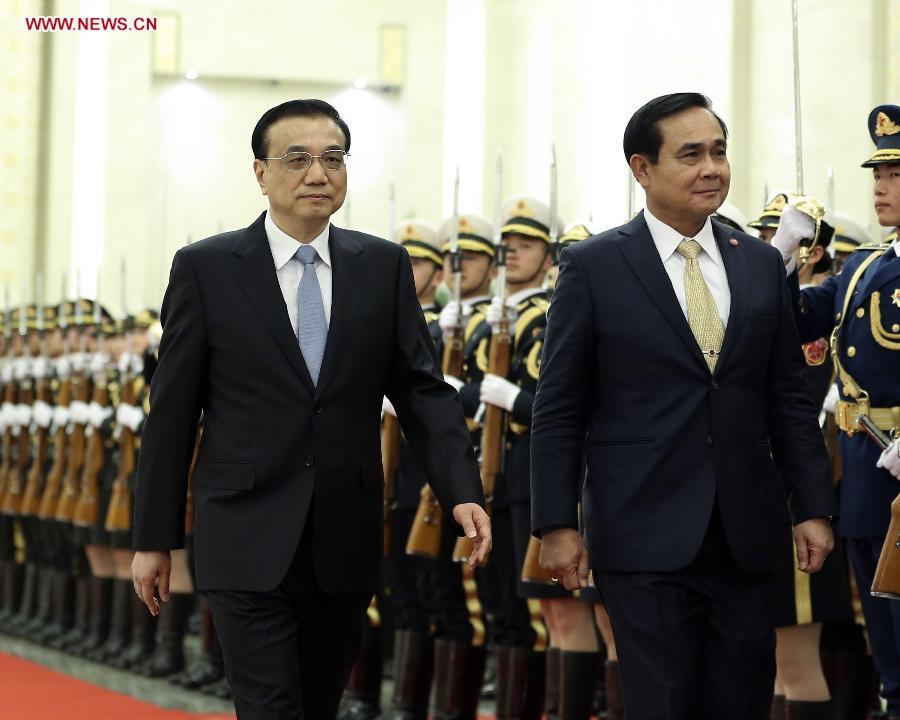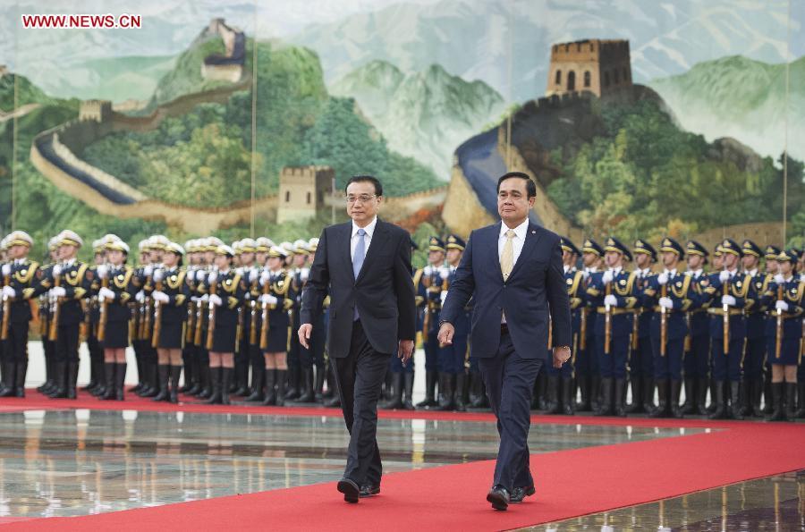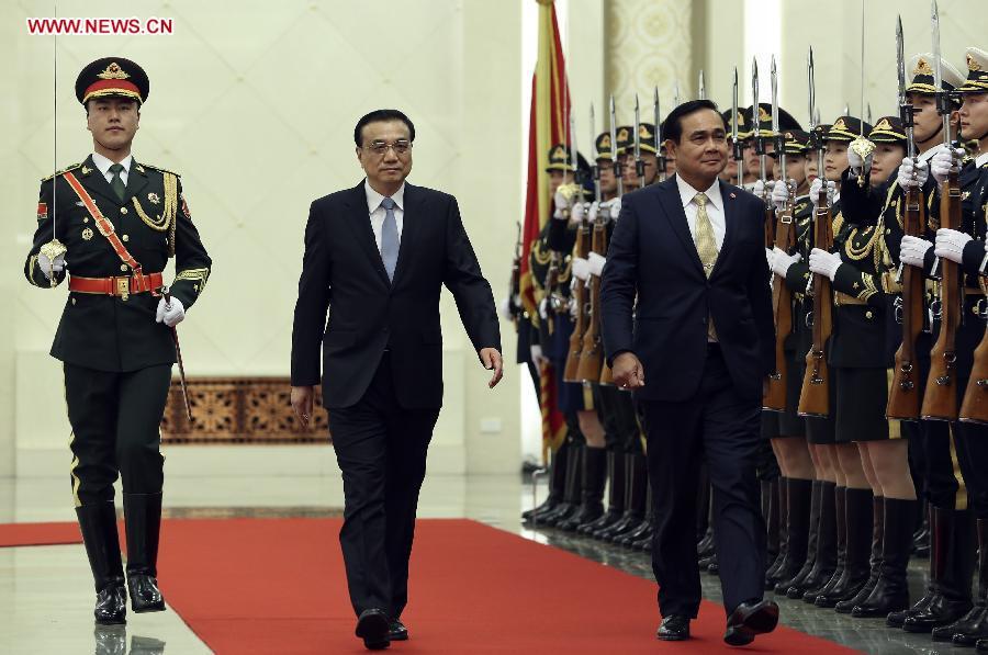 Chinese Premier Li Keqiang (L front) and visiting Thai Prime Minister Prayuth Chan-ocha (R front) inspect the guard of honor during a welcoming ceremony before their talks in Beijing, capital of China, Dec 22, 2014. (Xinhua/Xie Huanchi)
