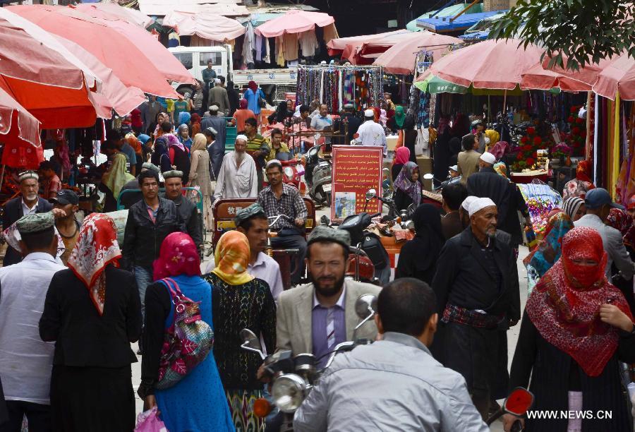 Locals buy melons at the Id Kah Bazaar in the city of Hotan, northwest China's Xinjiang Uygur Autonomous Region. (Xinhua/Zhao Ge)