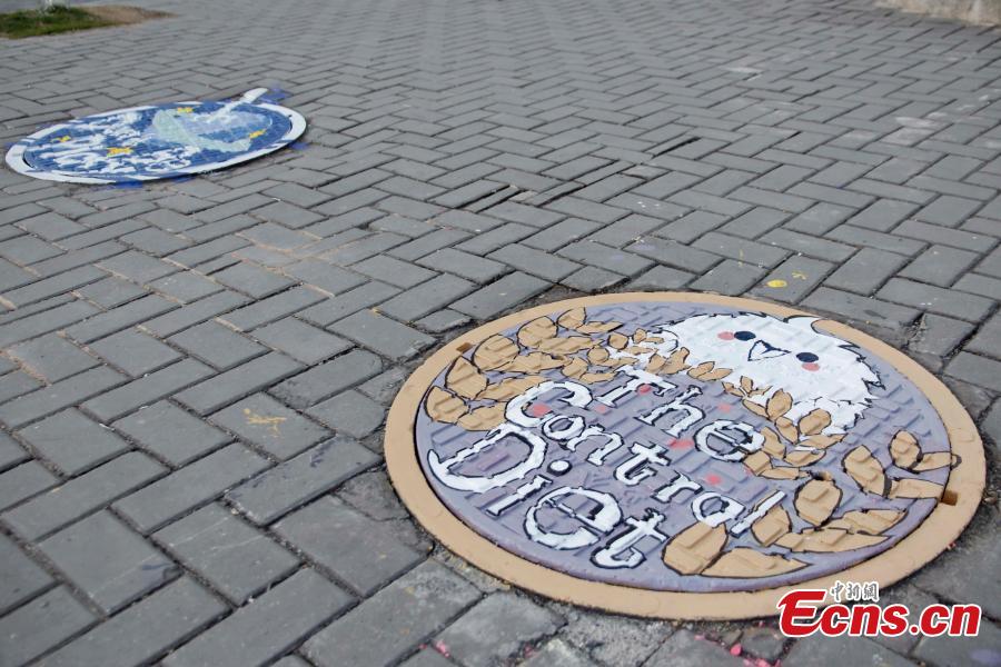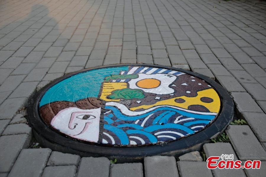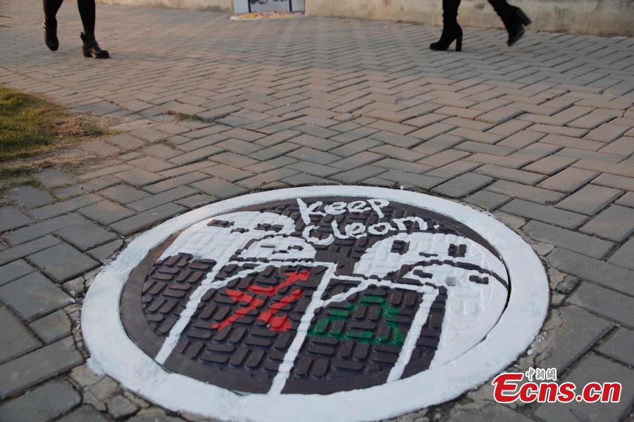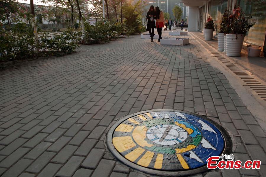 A manhole cover is painted with a cartoon image at the Guangxi Arts University in Nanning, Southwest China’s Guangxi Zhuang autonomous region, Dec 22, 2014. Students from the university’s Fine Arts School painted more than 40 manhole covers on campus during a graffiti contest themed “Green Chinese Dream.” [Photo: China News Service/Song Hantao]