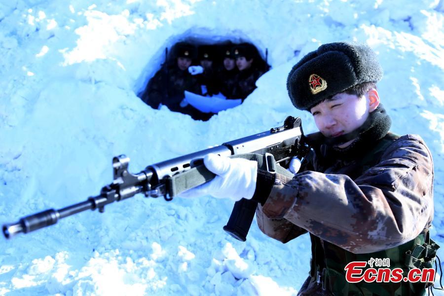 A female soldier from a border defense platoon takes shooting exercise braving extreme cold in Heihe, Heilongjiang province in December, 2014. Located at 50 degrees north latitude, Heihe city neighbors Blagoveshchensk in Russia across the Amur River, or Heilong Jiang. Temperature dips to as low as minus 50 C in its half-year-long winter. [Photo: China News Service/ Li Jianfeng]