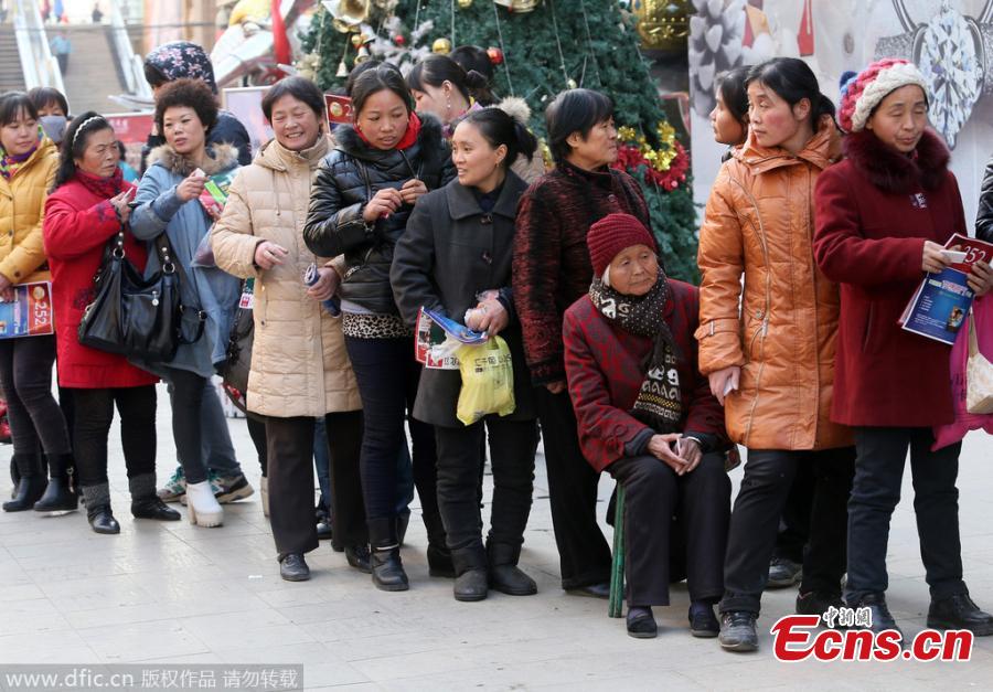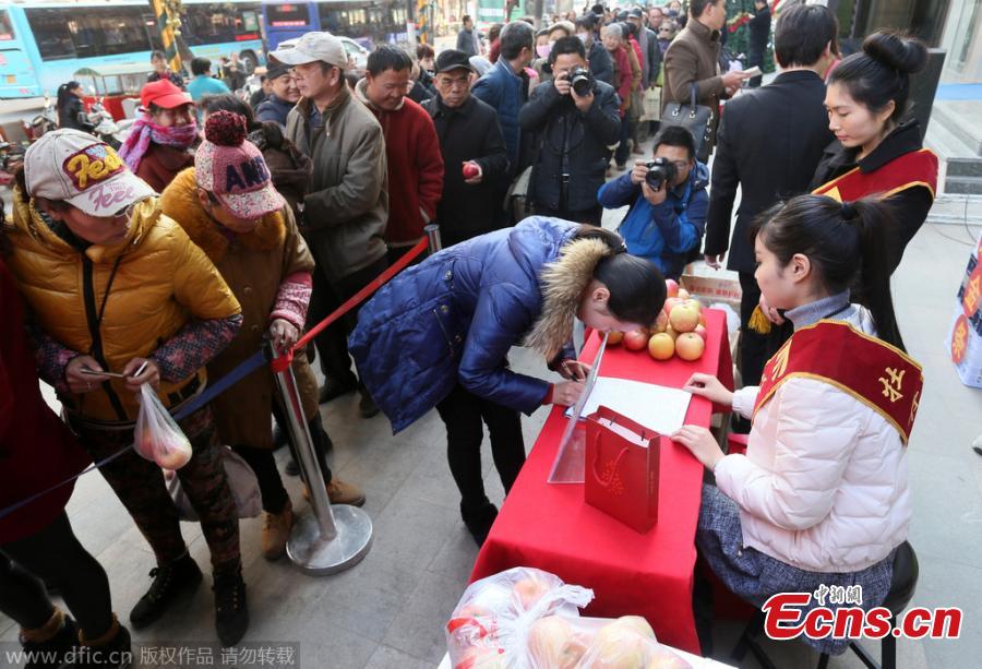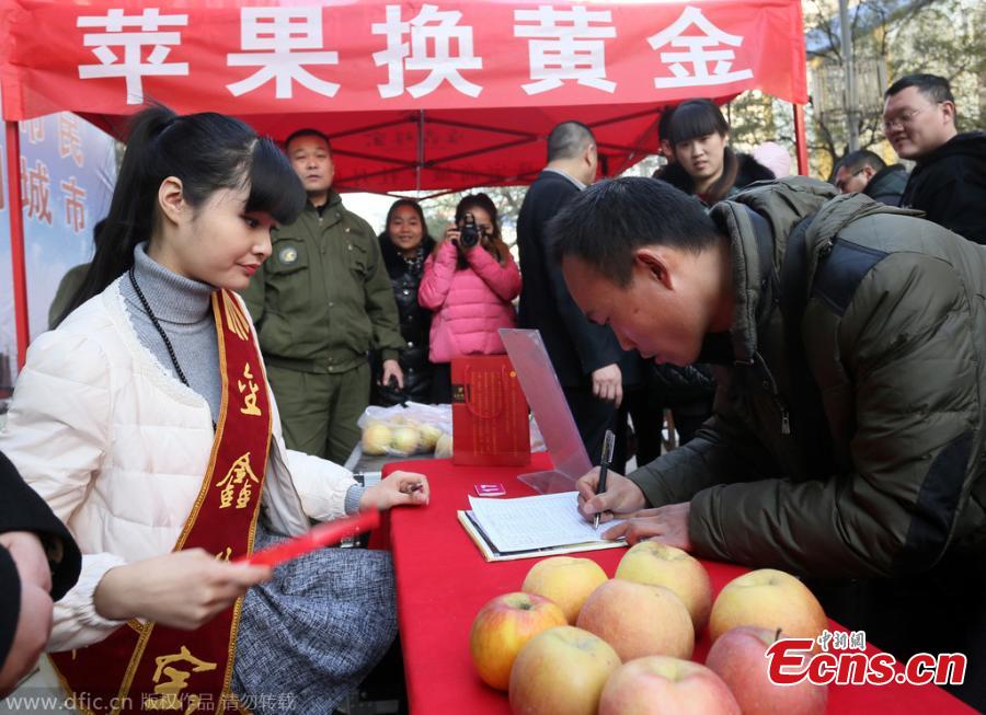 A man signs before exchanging apples for a glod bar in front of a gold and jewelry store in Zhengzhou, Central China's Henan province, Dec 23, 2014. Around 200 people stand in long queues to exchange two apples for a small gold bar in the Christmas sales promotion. [Photo: China News Service/Lu Jian]