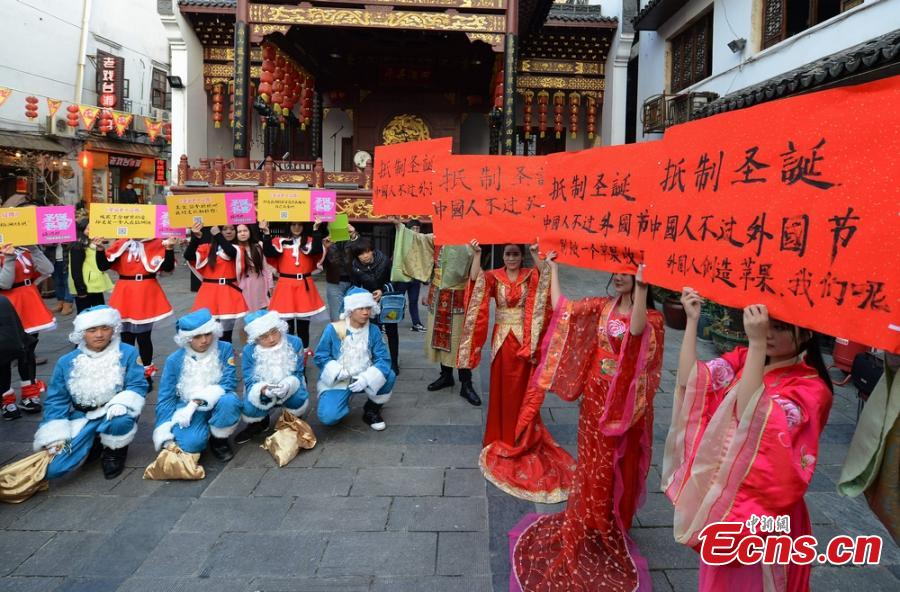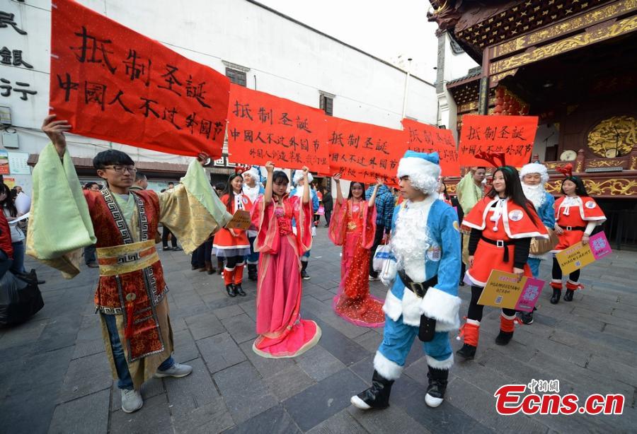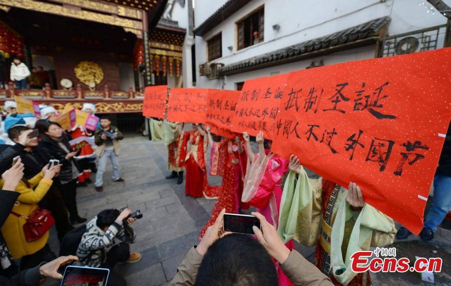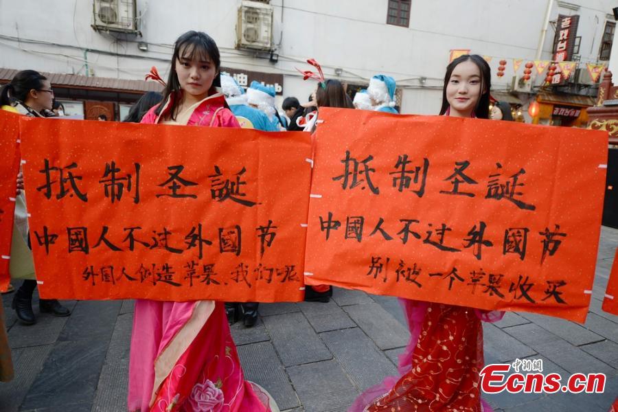 College students wearing traditional Chinese clothing join a campaign to boycott Christmas celebrations on a street in Changsha, Central China’s Hunan province on December 24, 2014. With slogans saying “Boycott Christmas-Chinese don’t celebrate foreign festivals” in hands, these students call on people to focus on Chinese traditional festivals and celebrate festivals in a rational way. [Photo: China News Service/ Yang Huafeng]