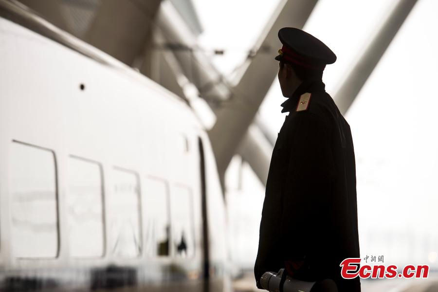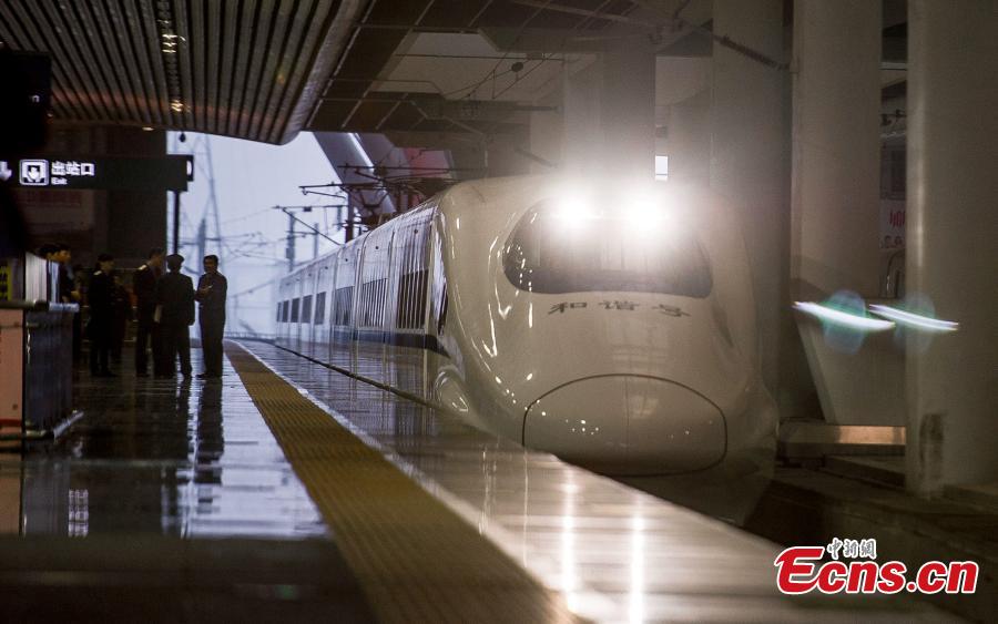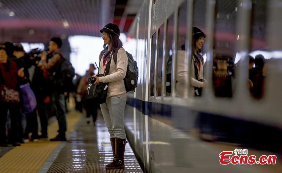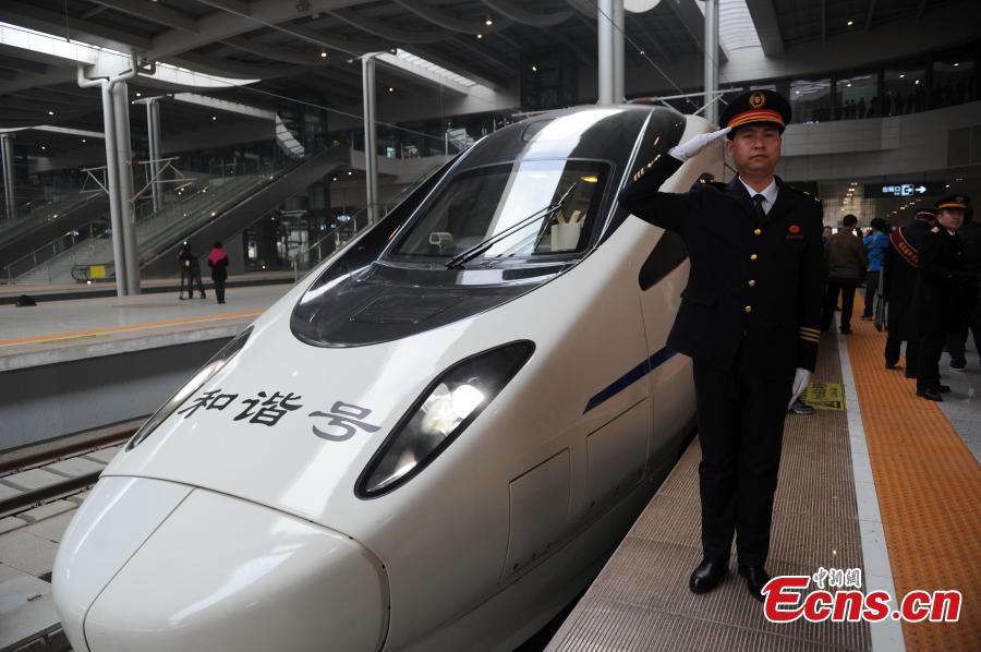 A bullet train makes its maiden trip from a railway station in Lanzhou, Northwest China’s Gansu province to Urumqi, capital city of Xinjiang Uygur autonomous region, Dec 26, 2014. The Lanxin high-speed railway linking Urumqi with Xining, capital of Qinghai Province, and Lanzhou, slashes total travel time from more than 23 hours to 11 hours and 50 minutes. The 1,776-km high-speed rail line, with a designed speed of 250 km per hour, is China's first high-speed railway built in a high-altitude region. Train attendants also performed “flash mob” dances to celebrate the start of the line. [Photo: China News Service/Yang Yanmin]