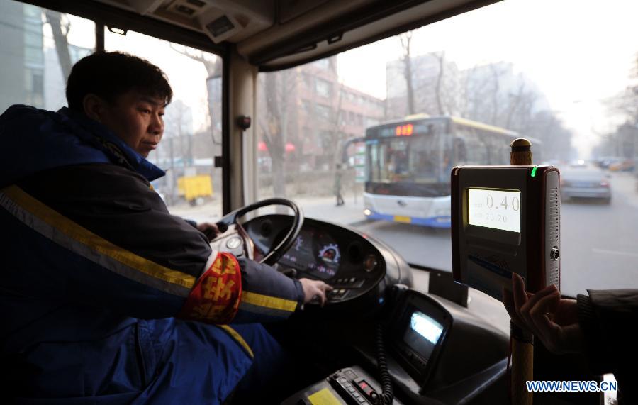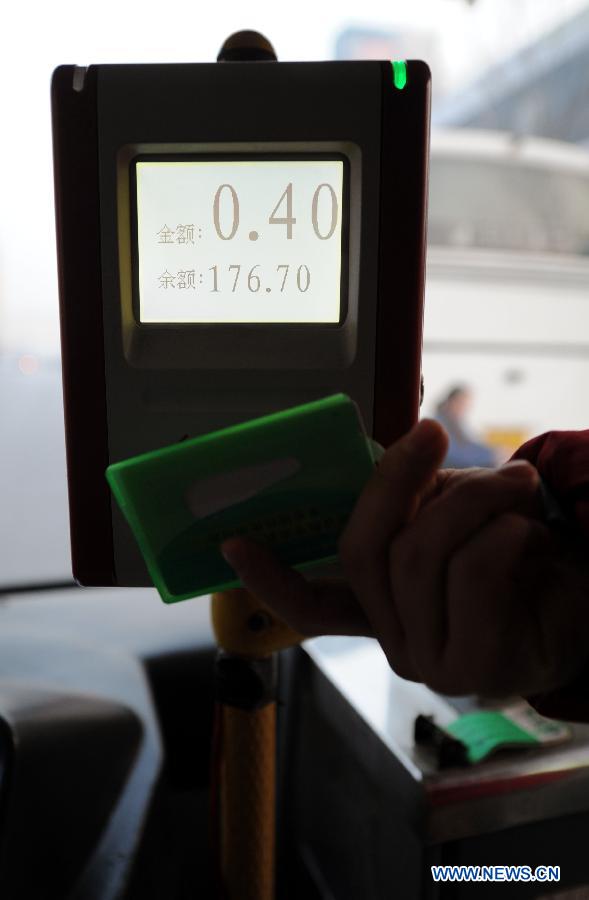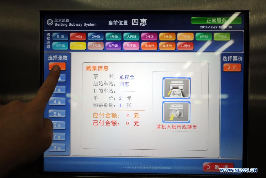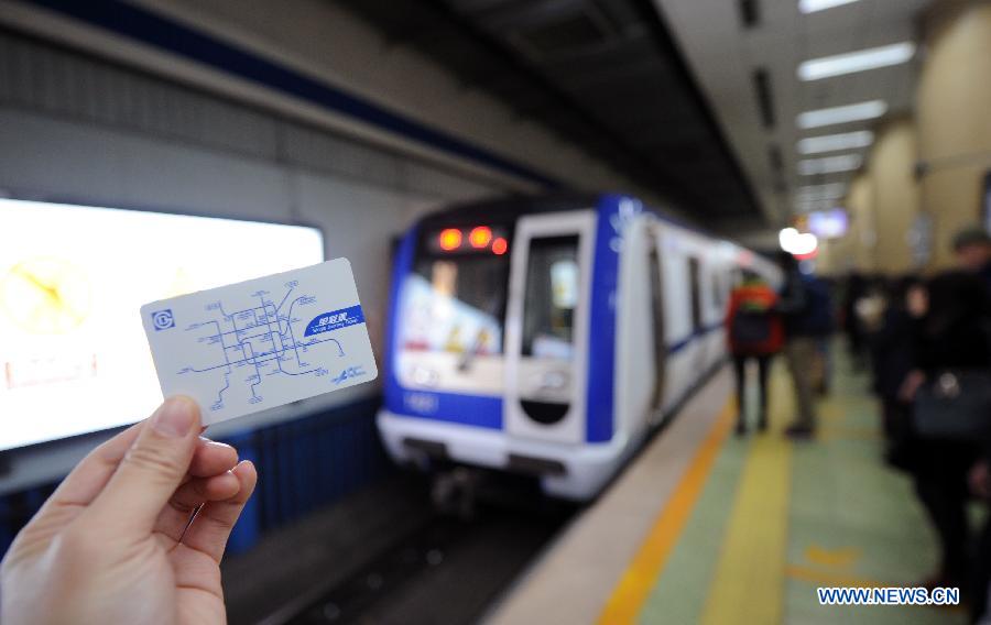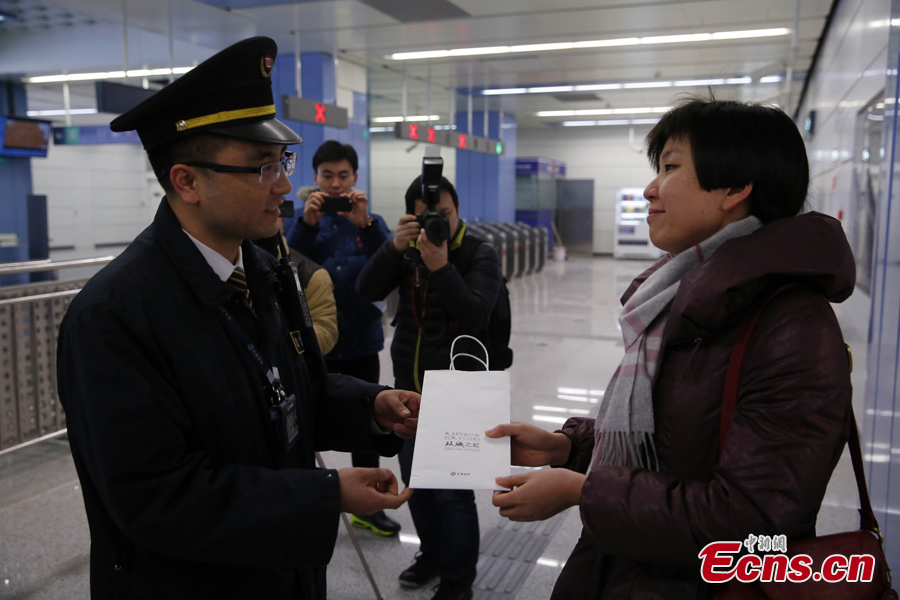The first passenger of subway Line 14 is welcomed by staff at Wangjing station of the metro in Beijing, Dec 28, 2014. The east section of Beijing subway Line 14 began operation on Sunday, Dec 28, and on the same day the city started to raise its fares on public transport. (Photo: China News Service/Han Haidan)
