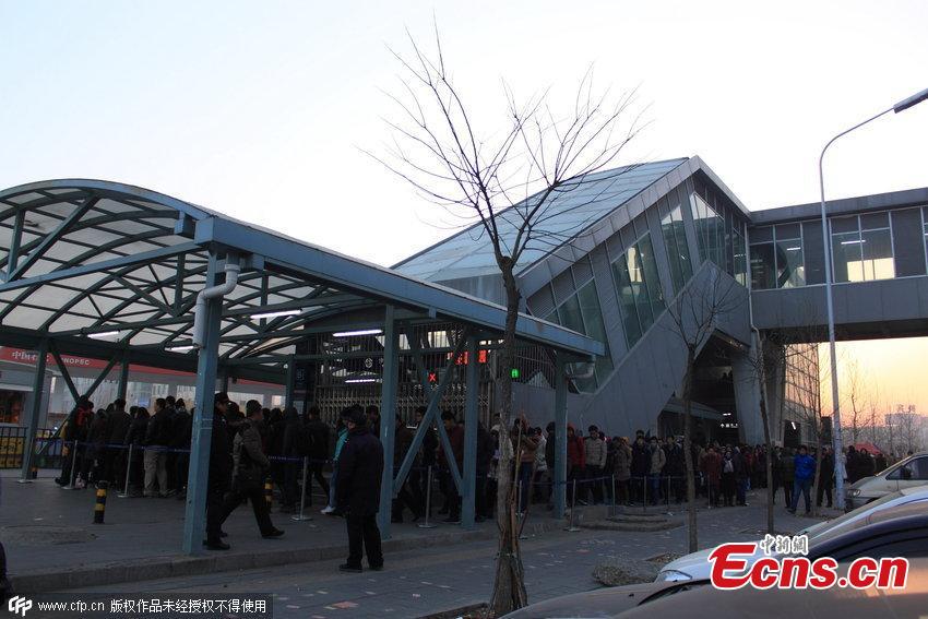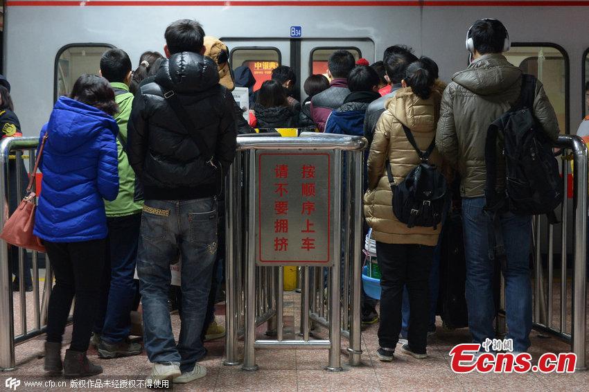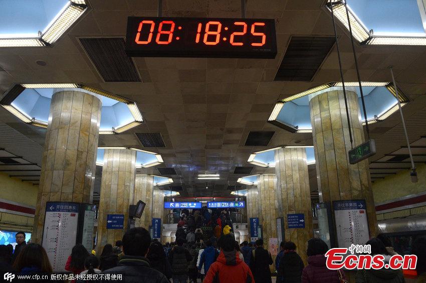 Passengers wait to board a train of subway Line One at a station in Beijing, Dec 29, 2014. Beijing has raised subway fares from Dec 28, but it seems to make little difference to the congestion on the public transport system. The city's subway system carries approximately 10 million passengers daily on workdays. [Photo/CFP]