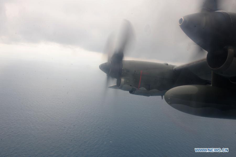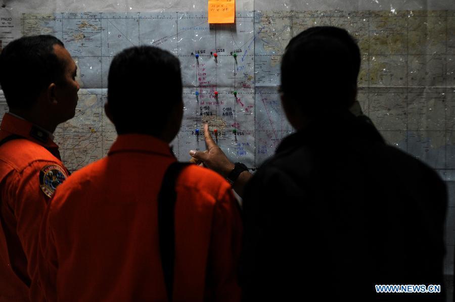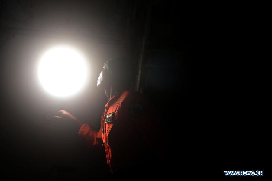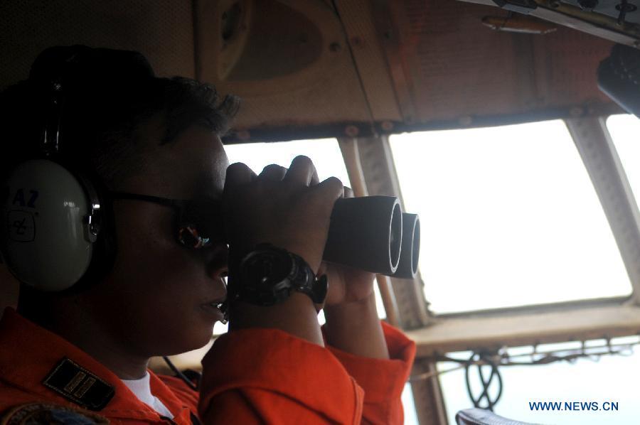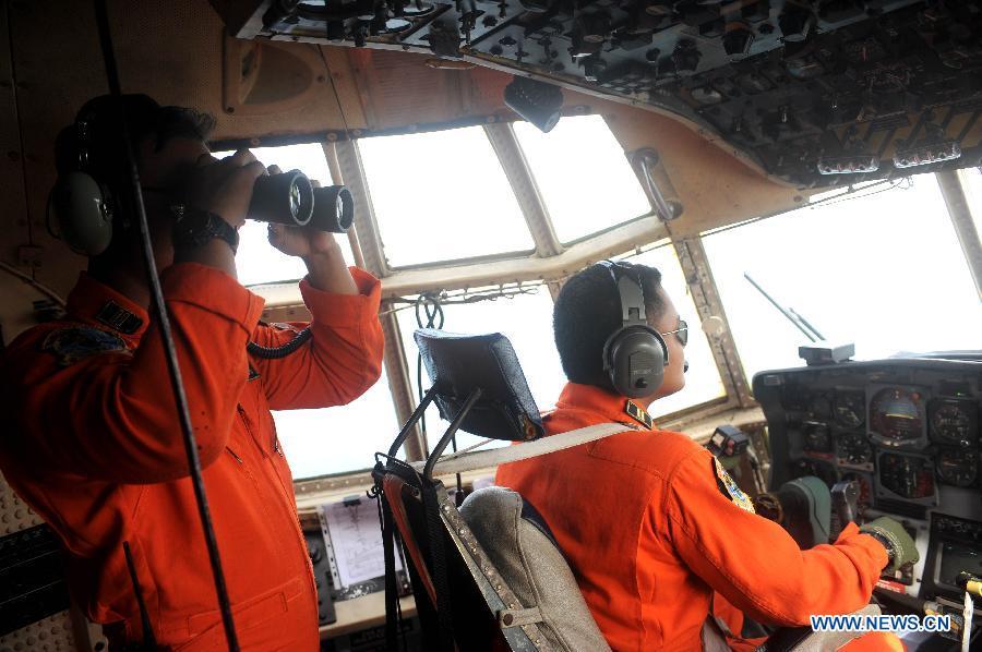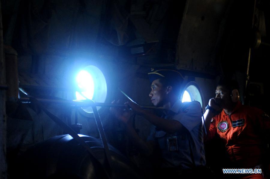 Indonesian air force personnel search for suspicious objects on the Hercules C-130 during a search operation of AirAsia Flight QZ8501 on the sea of the Karimata Strait, Indonesia, Dec 29, 2014. Suspicious objects were detected on Monday in the Java Sea where an AirAsia plane disappeared as the search operation expanded with more countries joining the sea and aerial hunt. (Xinhua/Agung Kuncahya B.)