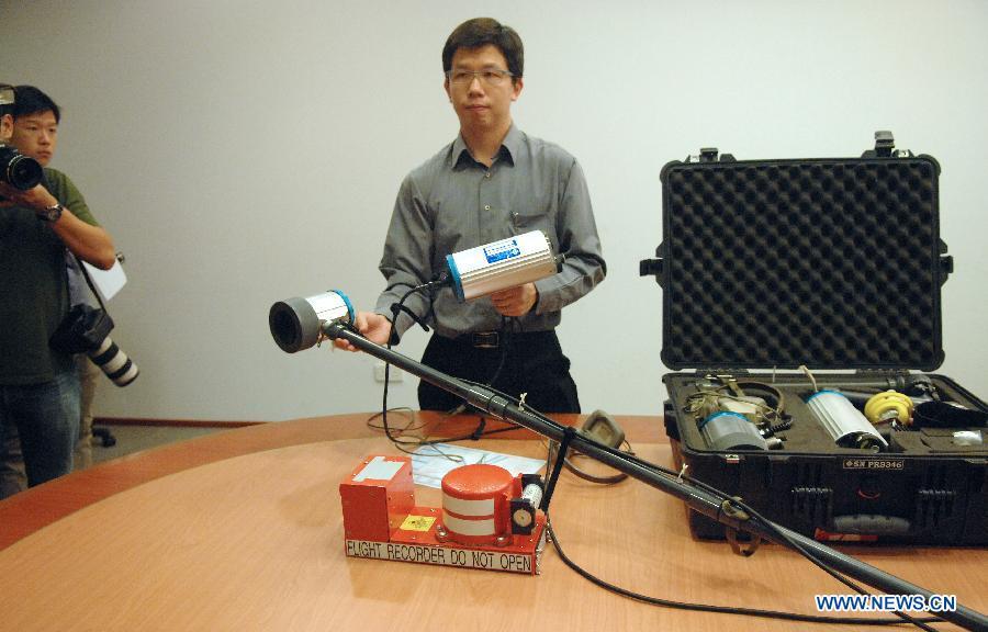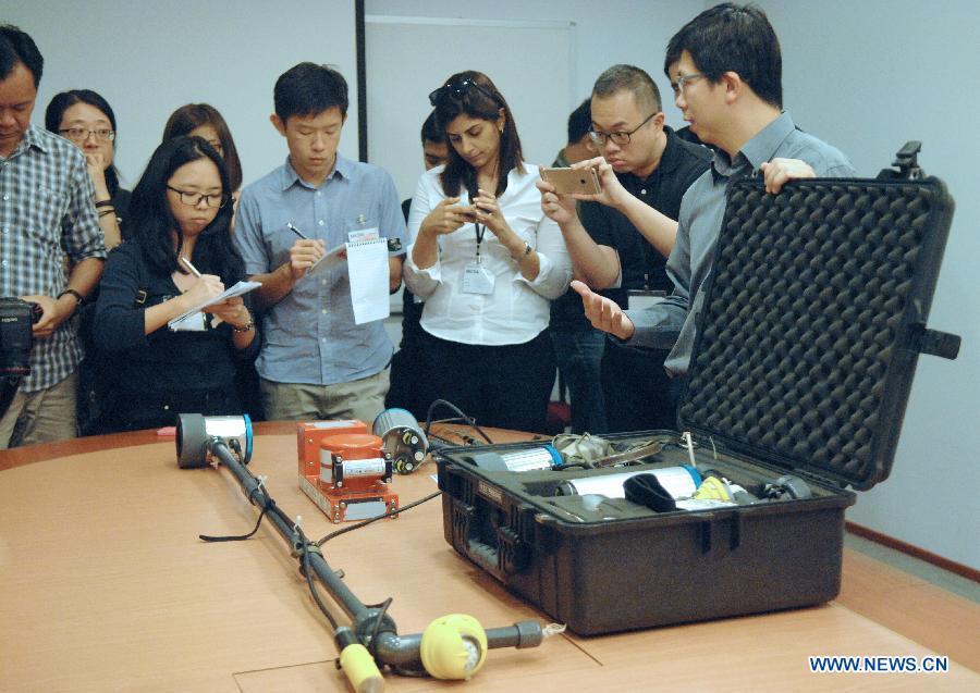 A rescue professional (1st R) from Singapore demonstrates the search and rescue equipment that will be used in the search for the missing AirAsia flight QZ8501 at Singapore's Changi Airport, on Dec 29, 2014. The AirAsia flight QZ8501 scheduled to arrive at Changi Airport on Sunday lost contact with Indonesian air traffic control in Indonesian flight information region. Singapore has pledged support and will dispatch aircraft and equipment to support the search and rescue efforts in Indonesia. (Xinhua/Chen Jipeng)
