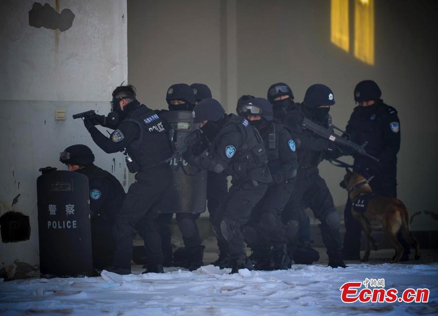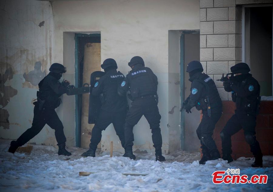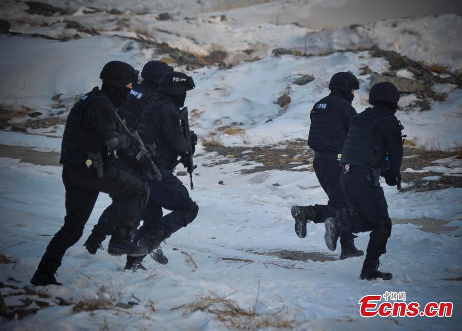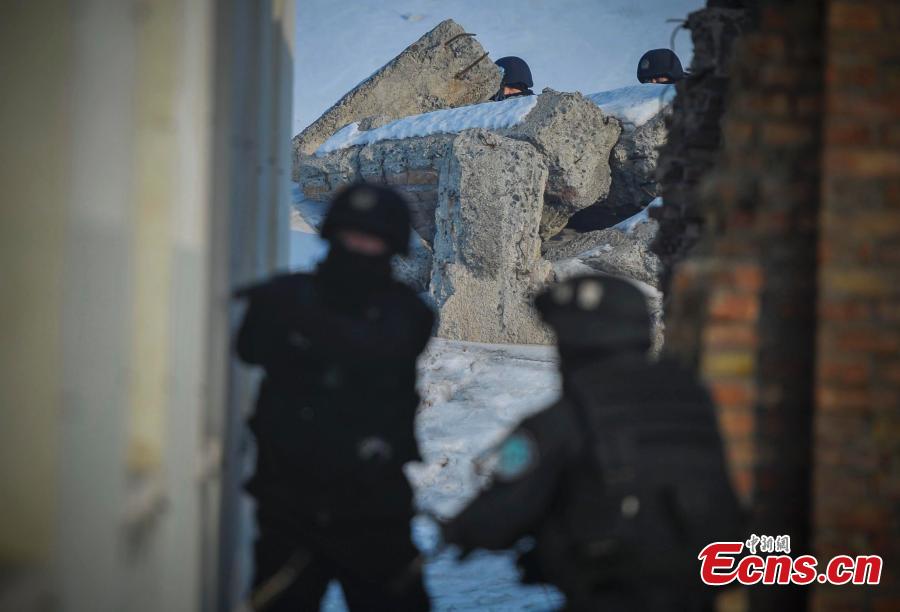 Members of a SWAT team join an anti-hijacking drill in Urumqi, Northwest China’s Xinjiang Uygur Autonomous Region, Dec 29, 2014. Held in an abandoned plant, the drill consisted of blitz on hijackers and rescue operations for hostages. [Photo/ Fang Tao]