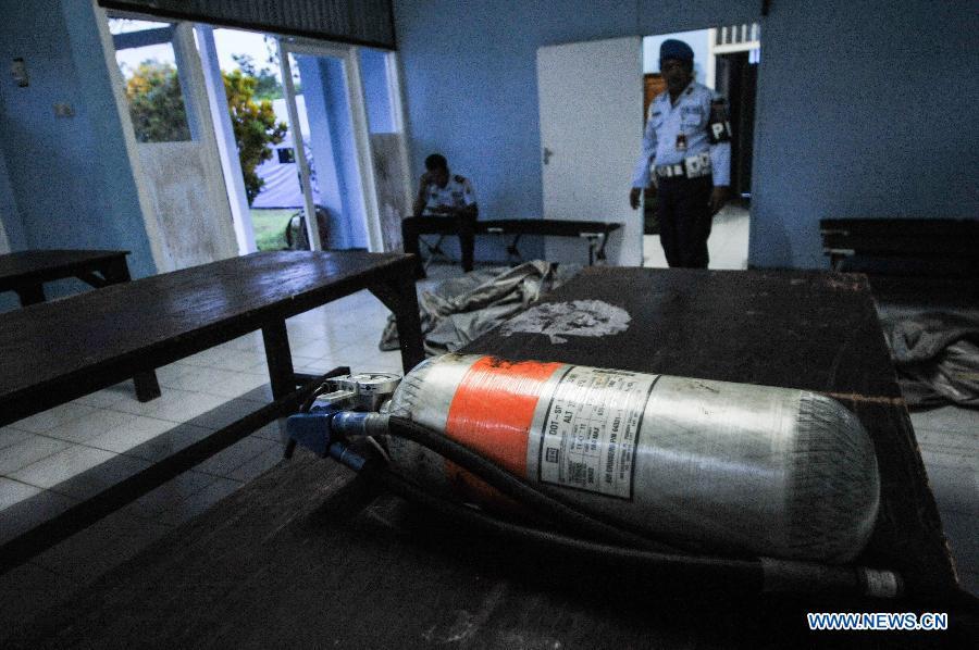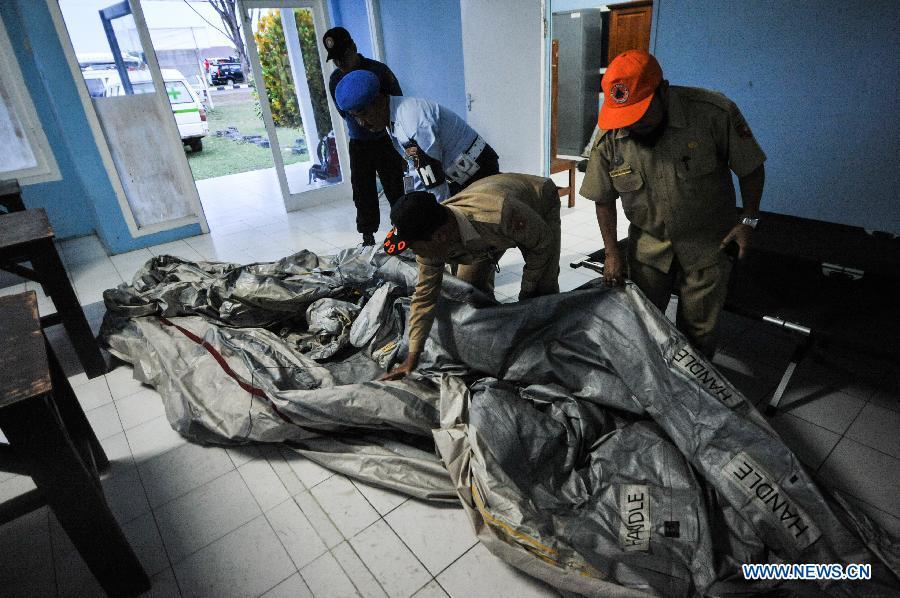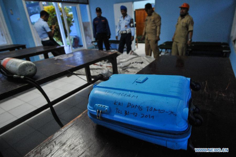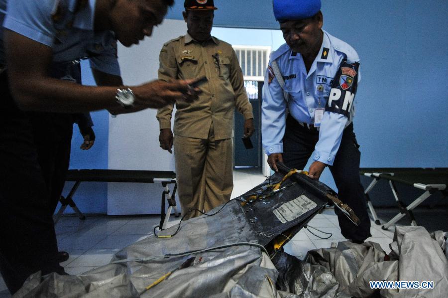 An officer checks objects suspected as belongings of AirAsia QZ8501 that found on the sea of Karimata at Pangkalan Bun airport, Central Kalimantan province, Indonesia, on Dec 30, 2014. Indonesian authorities have confirmed that the objects and corpses spotted are from the missing AirAsia plane and they will be brought to Pangkalan Aju in Pangkalan Bun of Central Kalimantan province, the nearest place to the location of the finding. (Xinhua/Veri Sanovri)