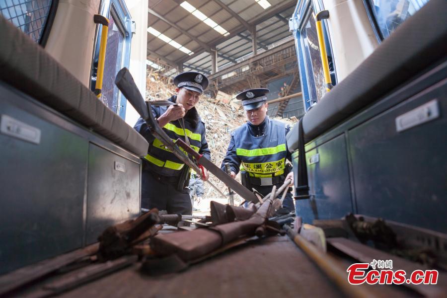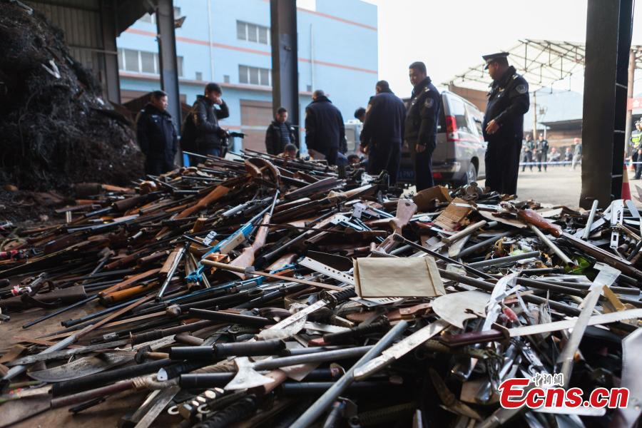 Police officers check confiscated illegal guns at a meltdown site in Huaxi district, Guiyang, capital city of Guizhou province, on Tuesday, December 30, 2014. A total of 2,830 illegal guns and 12,962 controlled kniveswere destroyed in the campaign. [Photo: China News Service/ He Junyi]