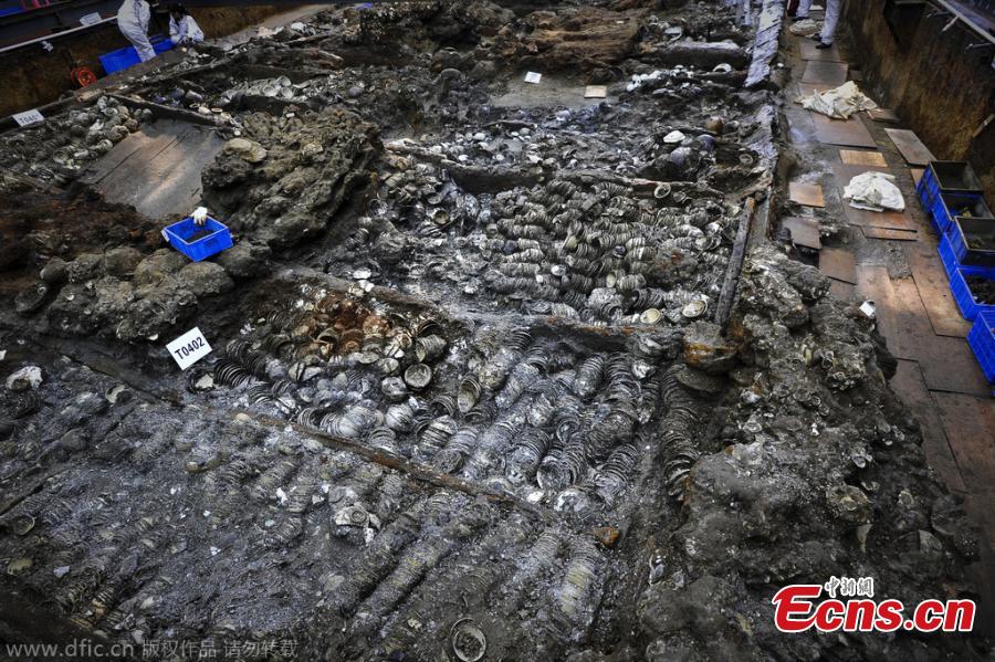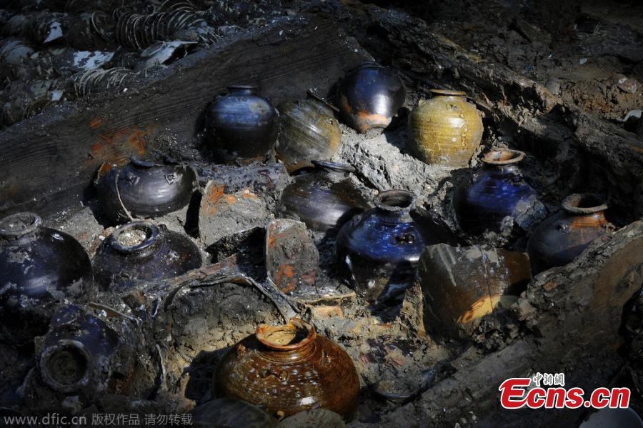 Relics are seen in the wrecked ship "Nanhai No 1" at a museum in Hailing, South China’s Guangdong province, Dec 30, 2014. Archeologists have started exploring the interiors of the Chinese merchant ship which sank off the south China coast during the Southern Song Dynasty between 1127 and 1279. In Nov 2013, the full-scale excavation of "Nanhai No 1" started, and so far 623 porcelain samples, 107 gold wares, 5,000 bronze coins, and many other cultural relics have been extracted from the wreck. [Photo/ IC]