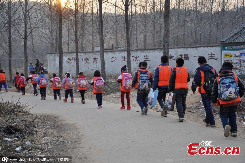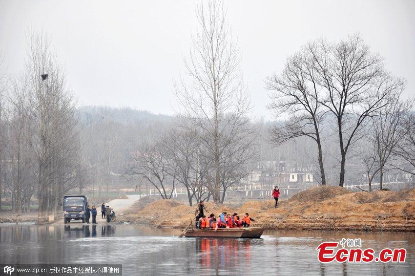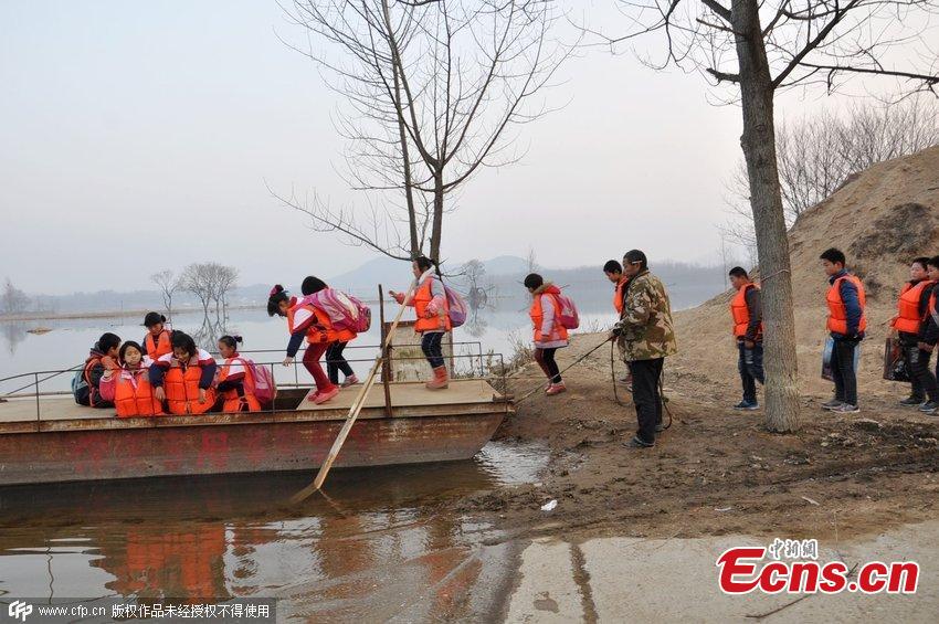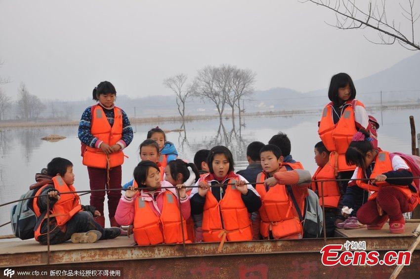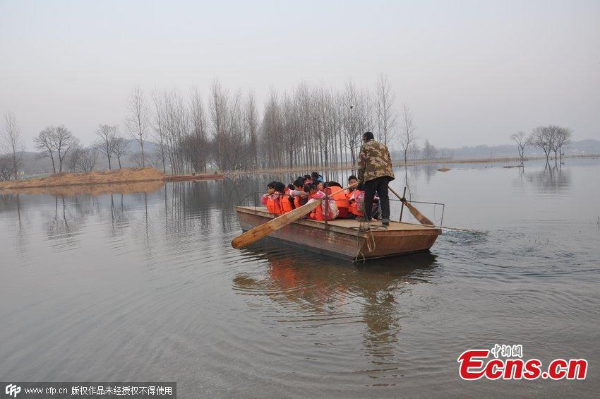 Primary students take a boat to cross a river after school in Queshan county, Central China’s Henan province, Dec 30, 2014. A bridge for students to go to school has been fully submerged by heavy rainfall. Town government rent a small boat and hired an experienced boatman for 23 students to commute. [Photo/CFP]