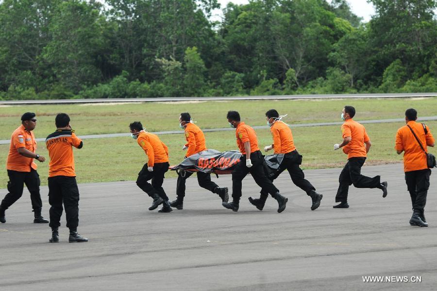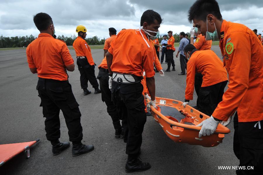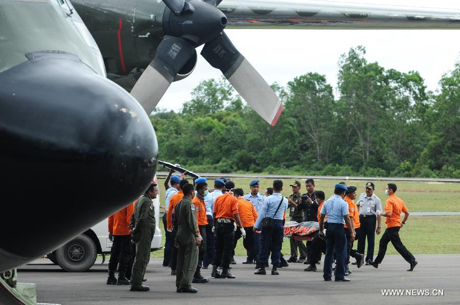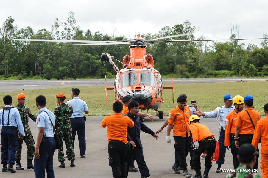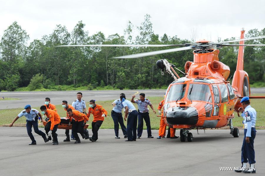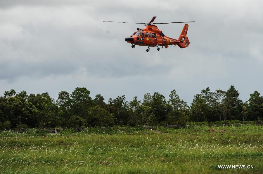 A helicopter of Search and Rescue (SAR) team brings back dead bodies of victims on AirAsia flight QZ8501 at Iskandar Air Base, in Pangkalan Bun, Central Kalimantan, Indonesia, Dec 31, 2014. Indonesian rescuers searching for the missing AirAsia plane have spotted six bodies and recovered three from waters off the southern coast of Kalimantan island, shortly after they observed floating debris later confirmed to be from the ill-fated plane. (Xinhua/Veri Sanovri)