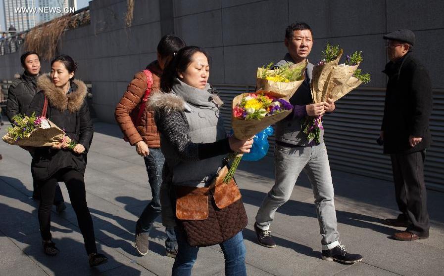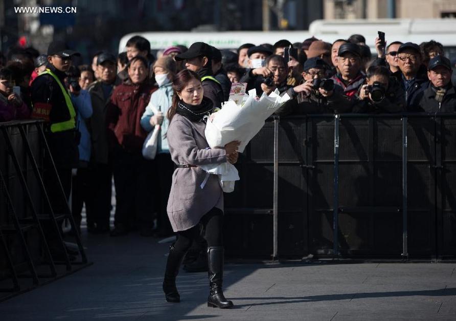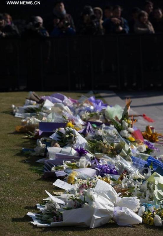 Citizens present bouquets to mourn the victims near the accident site of a stampede in Shanghai, east China, Jan. 2, 2015. New Year celebrations in Shanghai's bund area went astray Wednesday night as the fatal stampede killed at least 36 people and injured 49 others. (Xinhua/Jin Liwang)