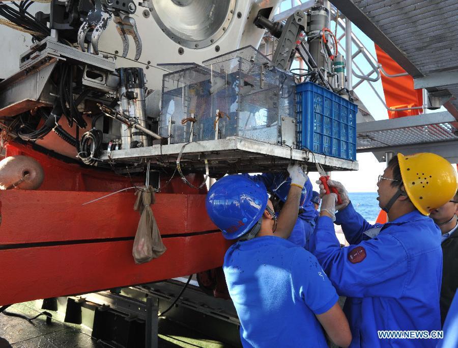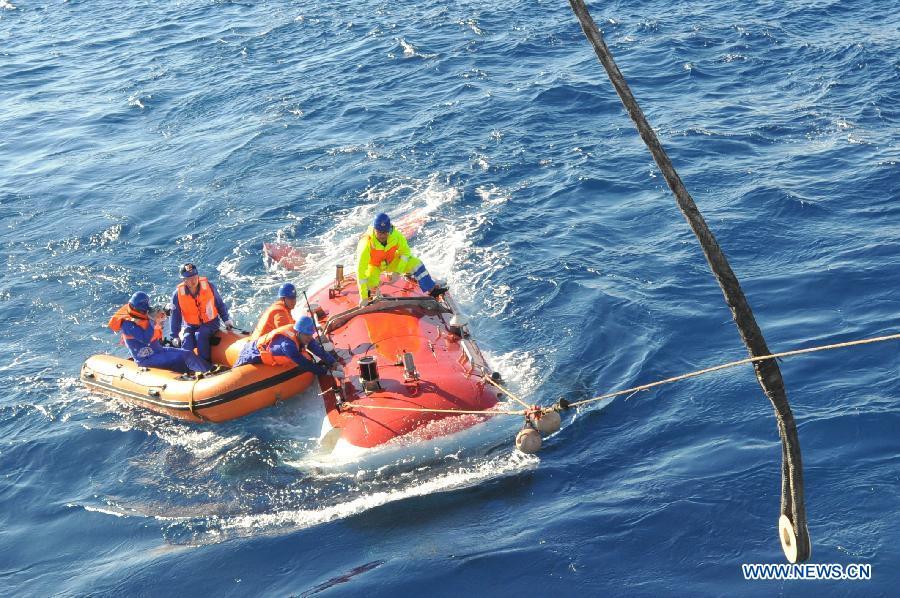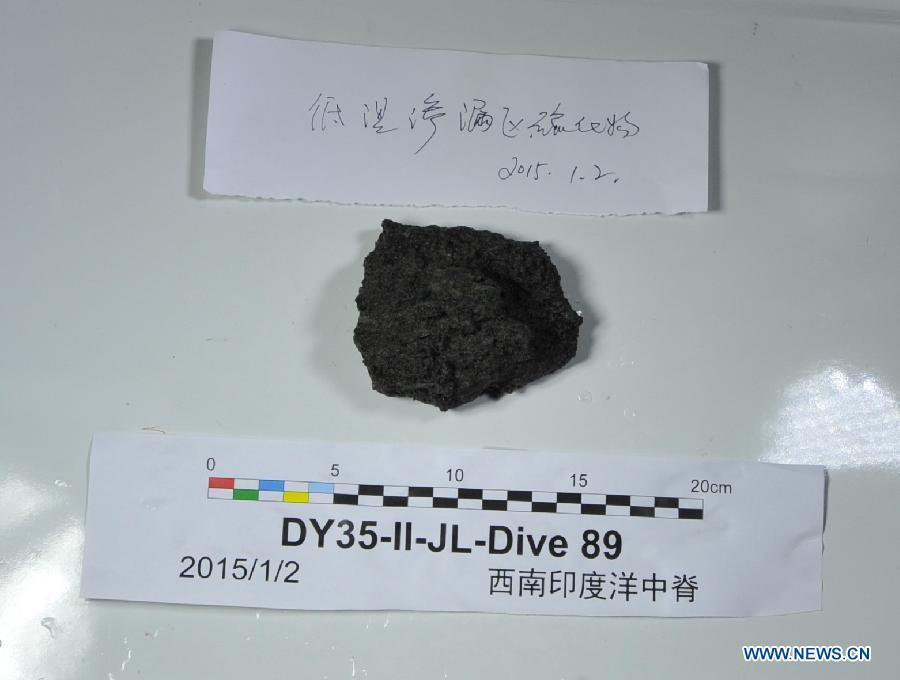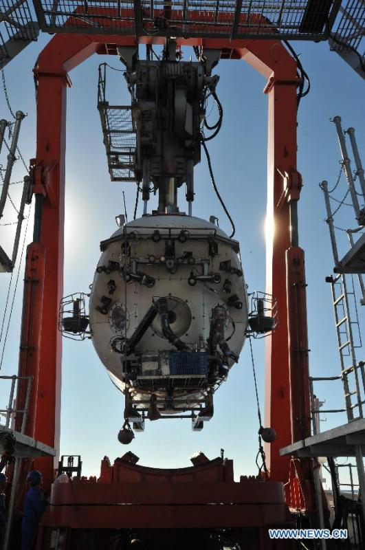 Photo taken on Jan. 2, 2015 shows China's deep sea manned submersible Jiaolong on its carrier Xiangyanghong 09 in the Indian Ocean. Jiaolong carried out the first dive on a mission to study active hydrothermal vent in the southwestern Indian Ocean on Jan. 2. It was the first time for the submersible to take the second batch of pilot trainees in the diving, which was intended to enable the trainees to learn some skills of submersible operation in active hydrothermal vent and collect samples of hydrothermal fluid, sulfide, rocks, sediment and water. (Xinhua/Zhang Xudong)