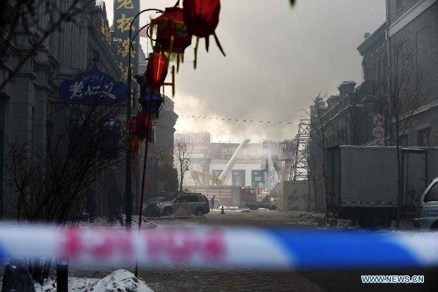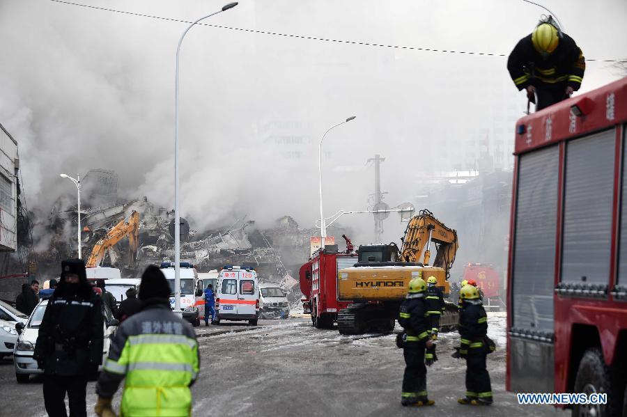 Smokes rise from a collapsed warehouse at the Beifangnanxun ceramics market in Harbin, capital of northeast China's Heilongjiang Province, Jan. 3, 2015. The fire broke out at about 1 p.m. on Friday. Five firefighters were killed and another 14 were injured on Friday night while they were trying to put out the fire. The cause of the fire is being investigated. (Xinhua/Wang Jianwei)