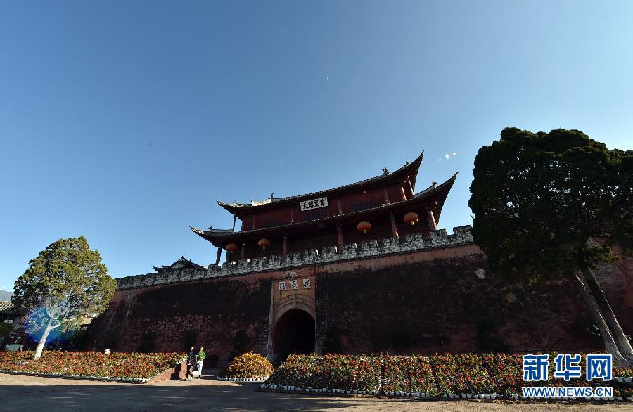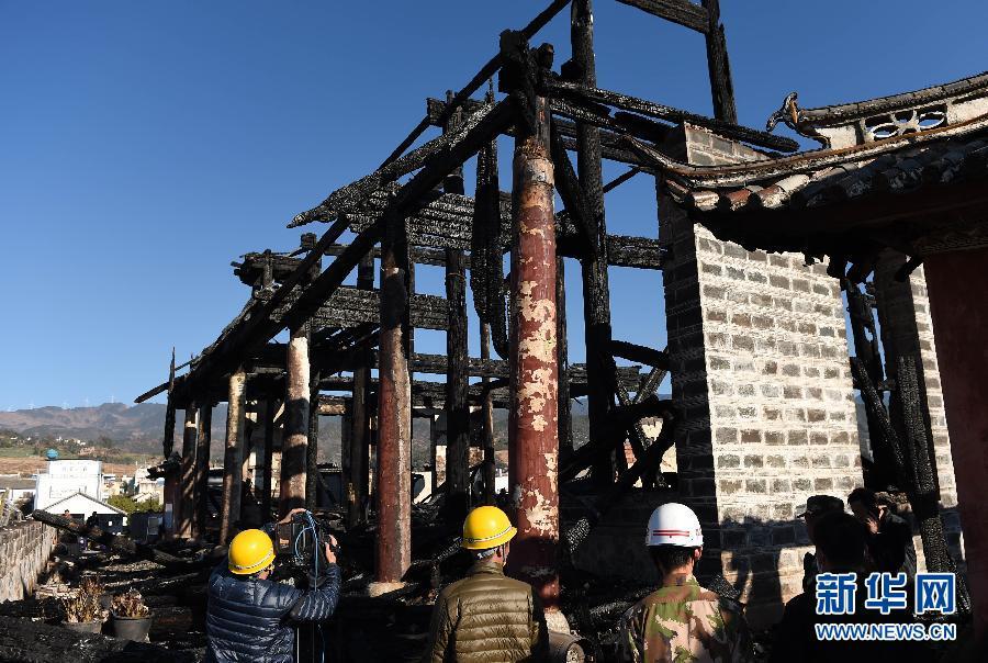 A crane is seen parked in front of the burnt "Gongchenlou", an ancient architecture built in Ming Dynasty (1368-1644), in Weishan County, southwest China's Yunnan province, Jan 3, 2015. A fire broke out on the building early on Saturday and was extinguished two hours later. No casualties has so far been reported. (Xinhua/Lin Yiguang)