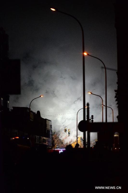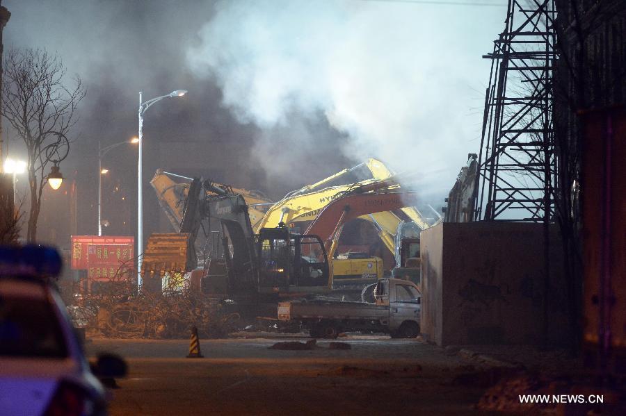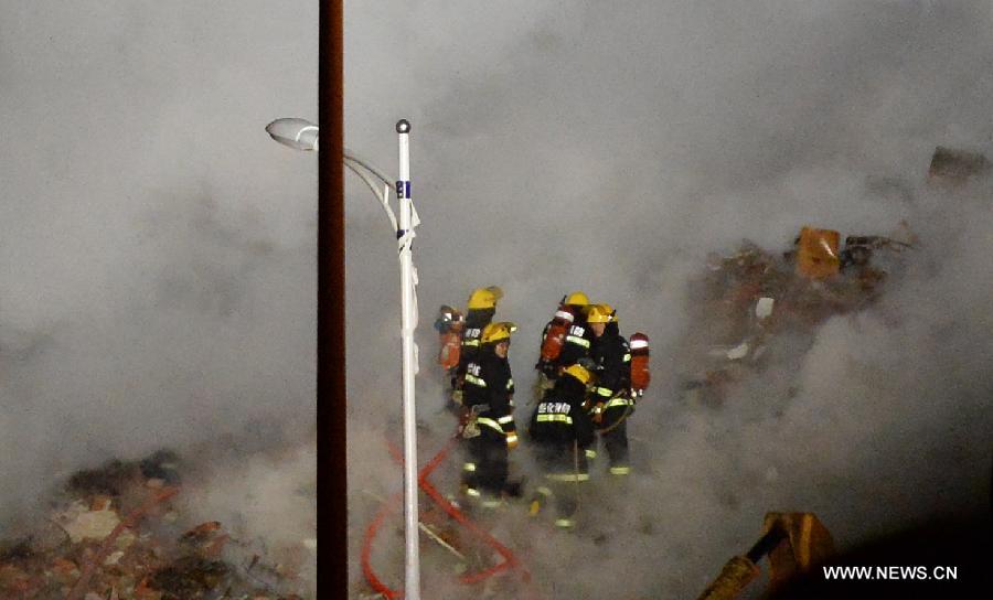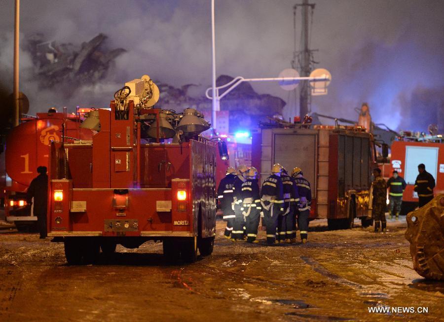 Firefighters are seen through smokes on a burnt warehouse in Harbin, capital of northeast China's Heilongjiang province, Jan 3, 2015. The death toll of the fire has climbed to five as the bodies of two missing firefighters have been found, local authorities said on Saturday. The fire broke out at about 1 pm on Friday afternoon on the warehouse, which is part of an 11-storey residential building. In total, five firefighters were killed and another 13 firefighters and a security guard were injured in the accident. (Xinhua/Wang Kai)