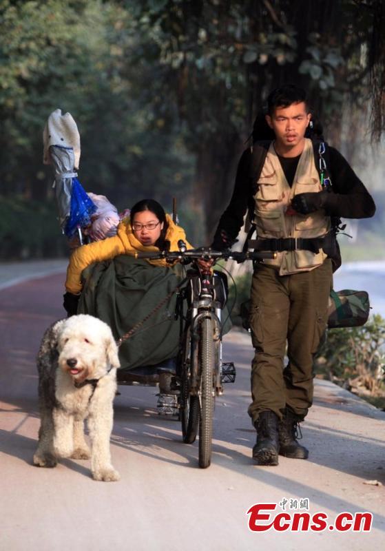 Ding Yizhou, a young man from Liuzhou, Guangxi and his girlfriend sitting in a dog-drawn wheelchair are on their journey to travel around China Jan 3, 2015. To fulfill the dream of his beloved one who can’t walk normally due to illness, Ding designed their tour route and employed a working dog to help the girl to travel. Ding said they have been hiking, and camping within Liuzhou for two days in a warm-up for the trip. [Photo/ CFP]