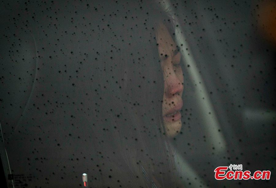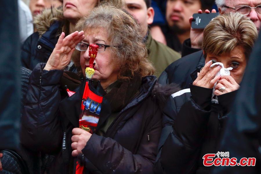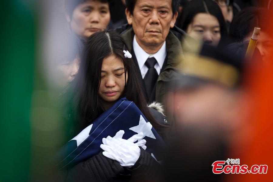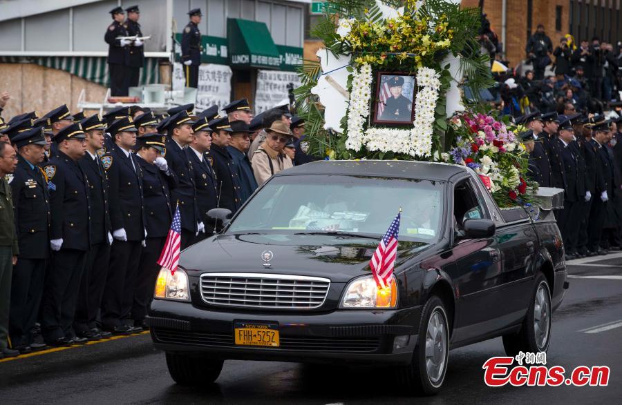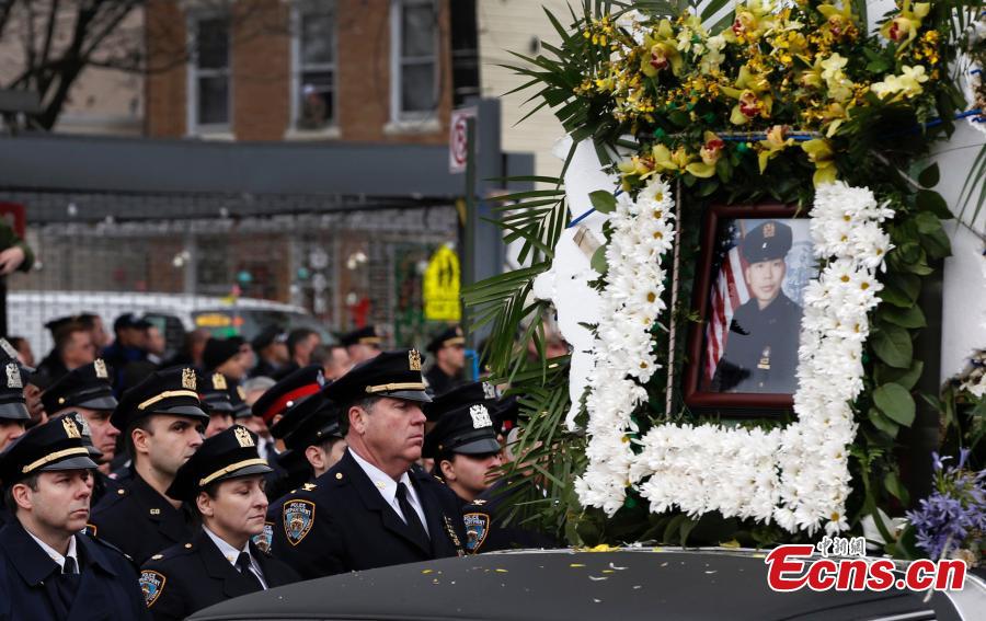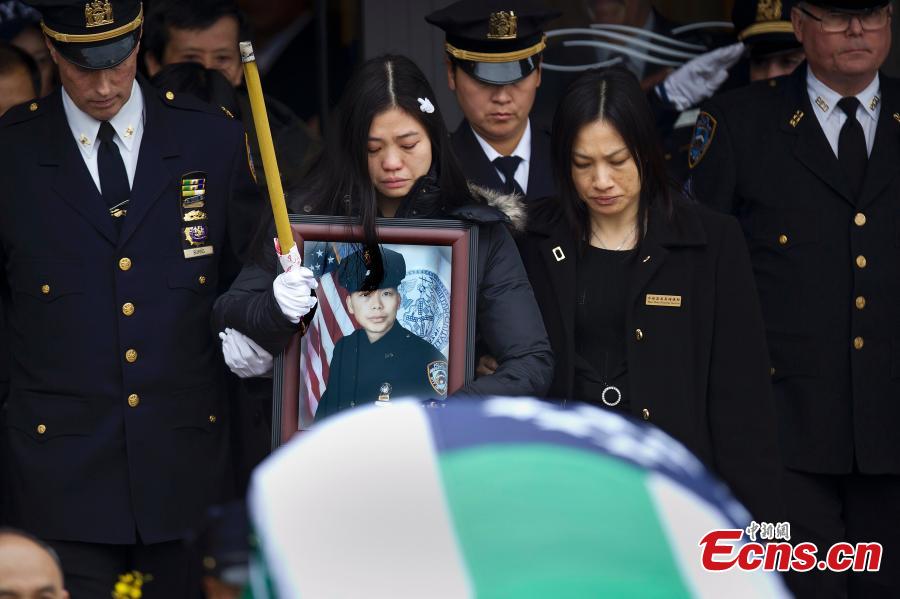 Widow Pei Xia Chen holds a photo of slain New York Police Department (NYPD) officer Wenjian Liu as his casket departs his funeral in the Brooklyn borough of New York January 4, 2015. Liu was killed days ago together with a colleague by a revengeful shooter. Thousands of mourners gathered in Brooklyn Sunday to pay their respects to him. [Photo/Agencies]