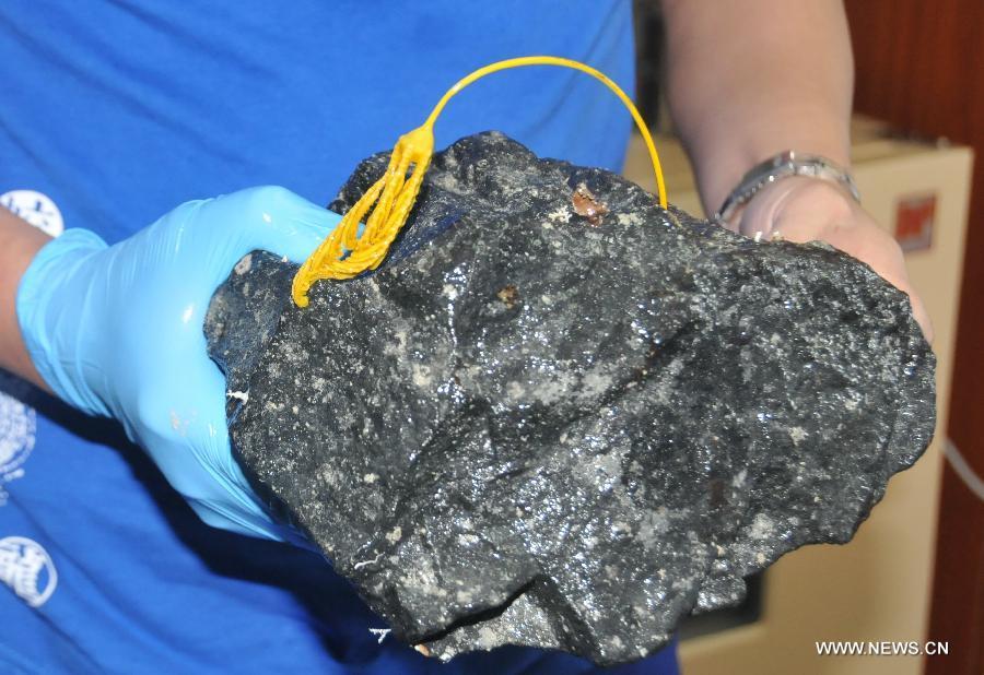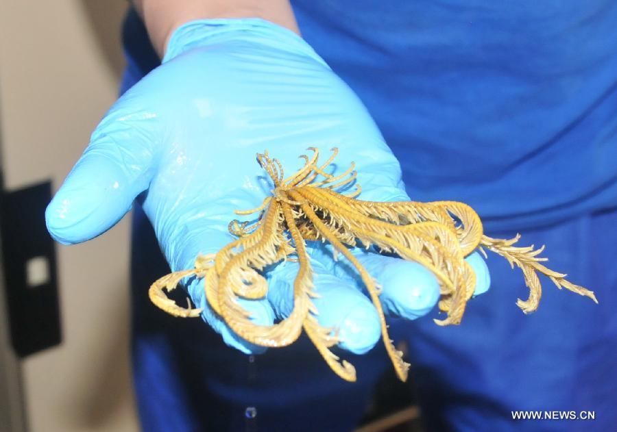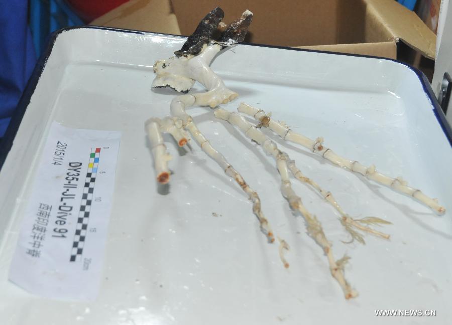 Photo taken on Jan 4, 2015 shows a piece of coral collected by China's deep sea manned submersible Jiaolong from seabed of a hydrothermal vent in the southwestern Indian Ocean. Jiaolong on Saturday collected a perfect "chimney vent" with several mussels and spiral shells living on it. (Xinhua/Zhang Xudong)