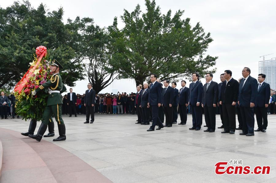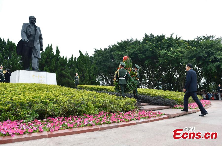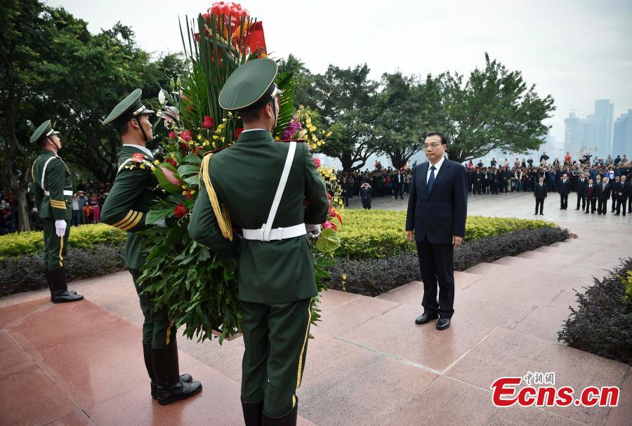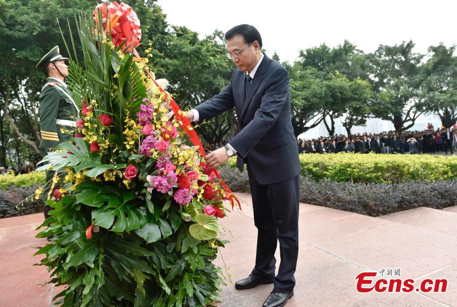 Premier Li Keqiang lays a flower basket adorned with ribbons at the foot of a statue dedicated to former Chinese leader Deng Xiaoping in Shenzhen, Guangdong province, Jan 5, 2015. The sculpture is situated on top of Lianhua mountain in Shenzhen, a city at the forefront of Deng's reforms and China's early window to the outside world. [Photo: China News Service / Liu Zhen]