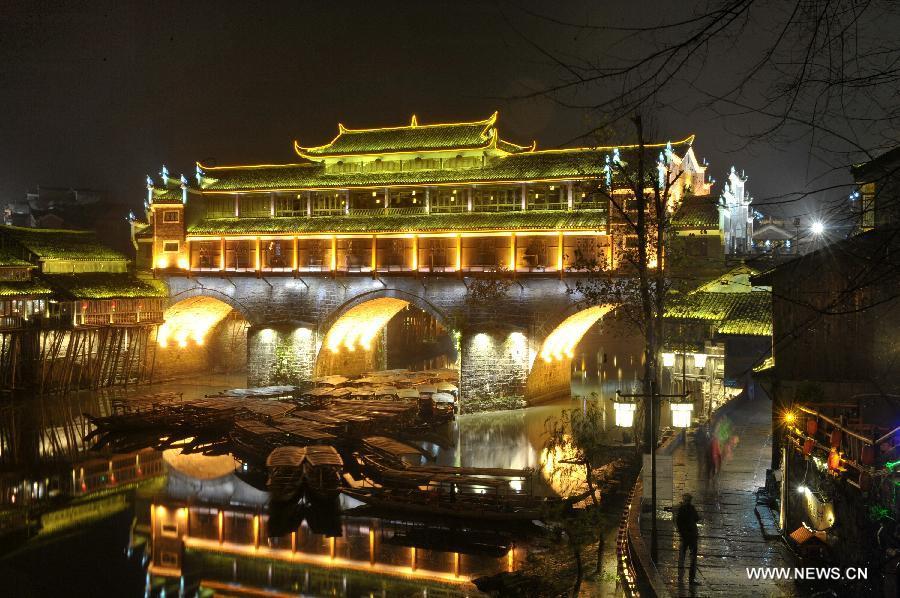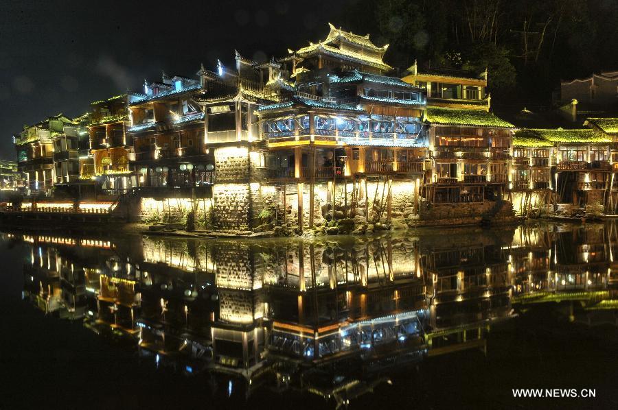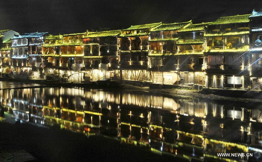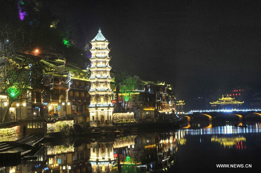 Photo taken on Jan 5, 2015 shows the night view of the ancient town of Fenghuang, central China's Hunan province. (Xinhua/Long Hongtao)