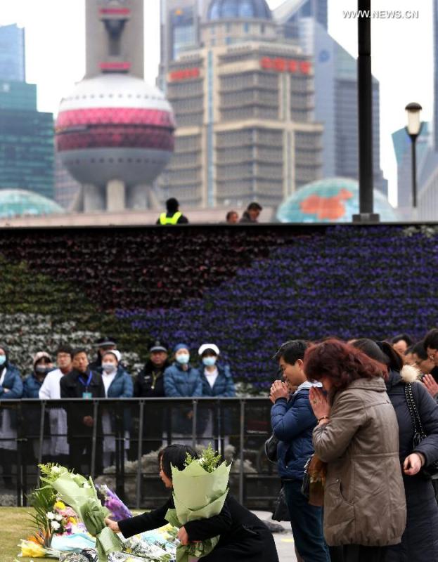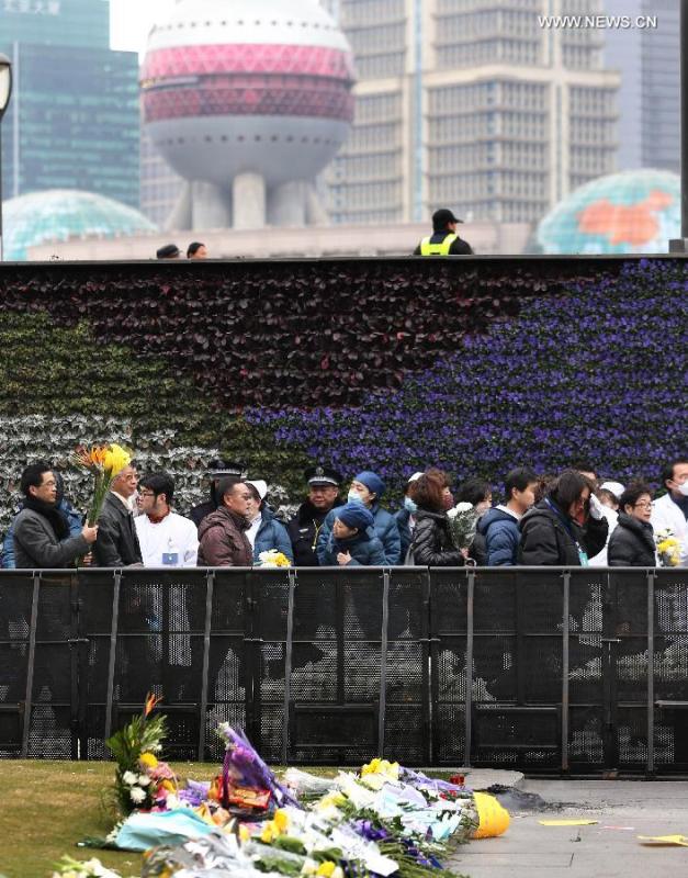 Flowers are presented to mourn for stampede victims at the Bund in Shanghai, east China, Jan 6, 2015, seven days after the tragedy. (Xinhua/Ding Ting)