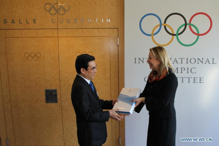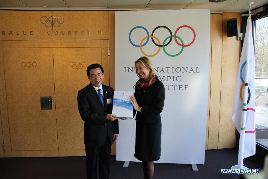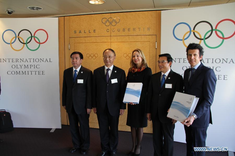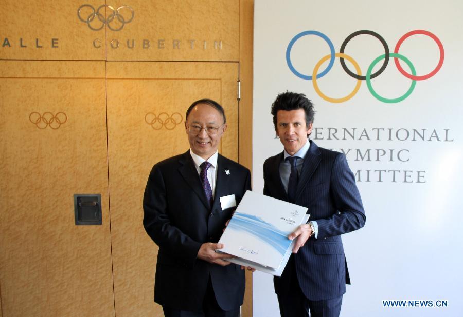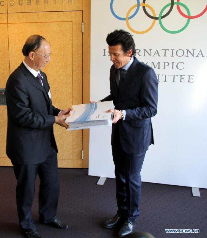 IOC Sports Director Christophe Dubi (R) receives from the hands of Minister of the General Administration of Sport of China and Chairman of the Chinese Olympic Committee Liu Peng the bid files at the International Olympic Committee headquarters in Lausanne, Switzerland on on Jan 6, 2015. Beijing on Tuesday handed over its official bid to host the 2022 Winter Olympics to the International Olympic Committee (IOC). (Xinhua/Zhang Miao)