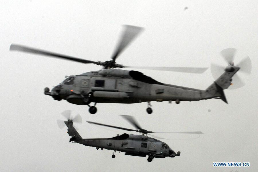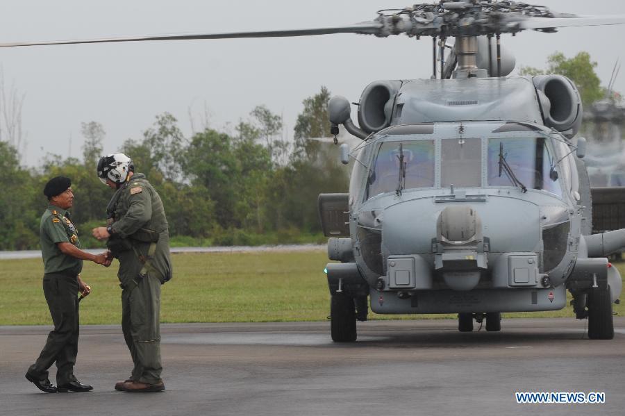 USS Seahawk helicopters participate in the search of AirAsia QZ8501 victims from the sky in Pangkalan Bun, Indonesia, Jan 6, 2015. The search operation for AirAsia Flight QZ8501 spreads slightly eastward on Tuesday as the weather and currents drag wreckage in that direction. (Xinhua/Agung Kuncahya B.)