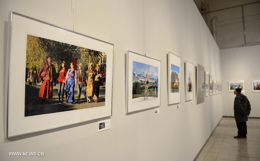 A visitor takes photo during a photography exhibition of Tibet in Shijiazhuang, capital city of north China's Hebei province, Jan 6, 2015. A total of 180 photos demonstrating the scenery and tradition of southwest China's Tibet Autonomous Region were on display. (Xinhua/Wang Xiao)