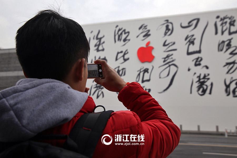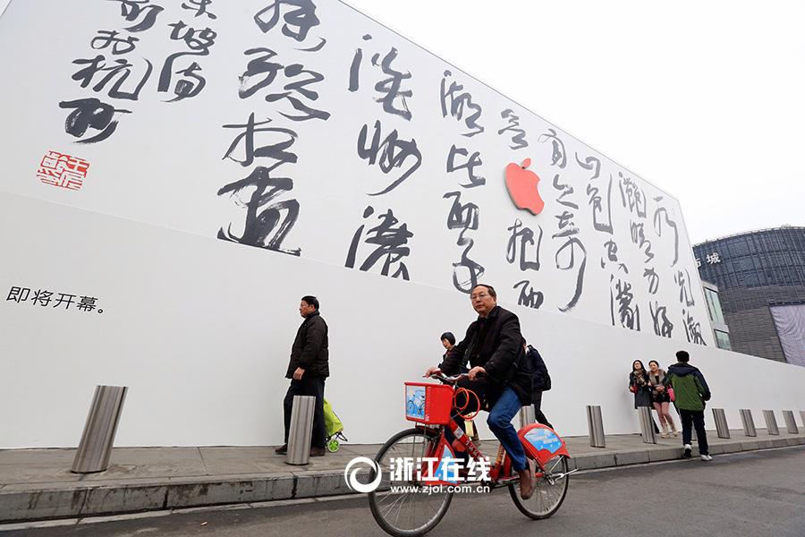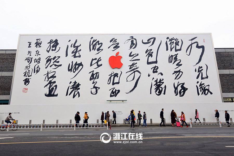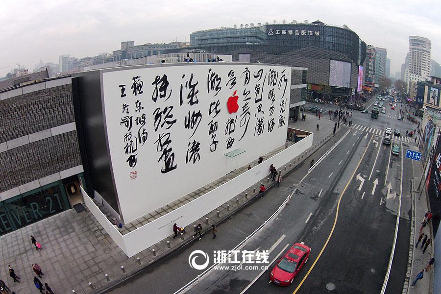 The facade of the biggest Apple flagship store in Asia has finished in Hangzhou, east China’s Zhejiang province. With a total floor area of 3,000 square meters, the store is decorated with Chinese calligraphy. (Photo source: www.zjol.com.cn)